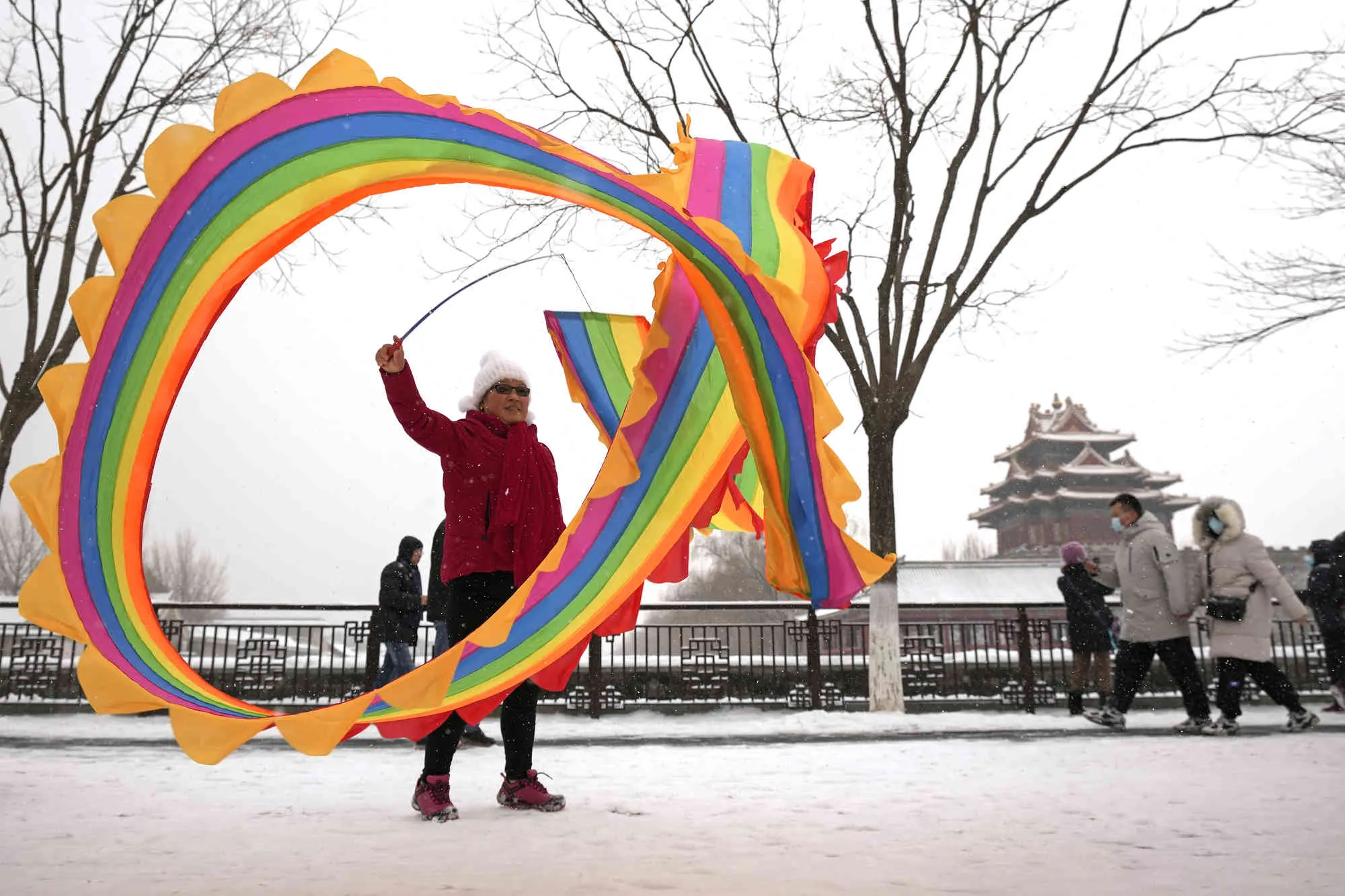 A resident plays a ribbon as visitors walk by the Turret of the Forbidden City covered with snow fall in Beijing, Sunday, February 13, 2022. (Photo by Andy Wong/AP Photo)
