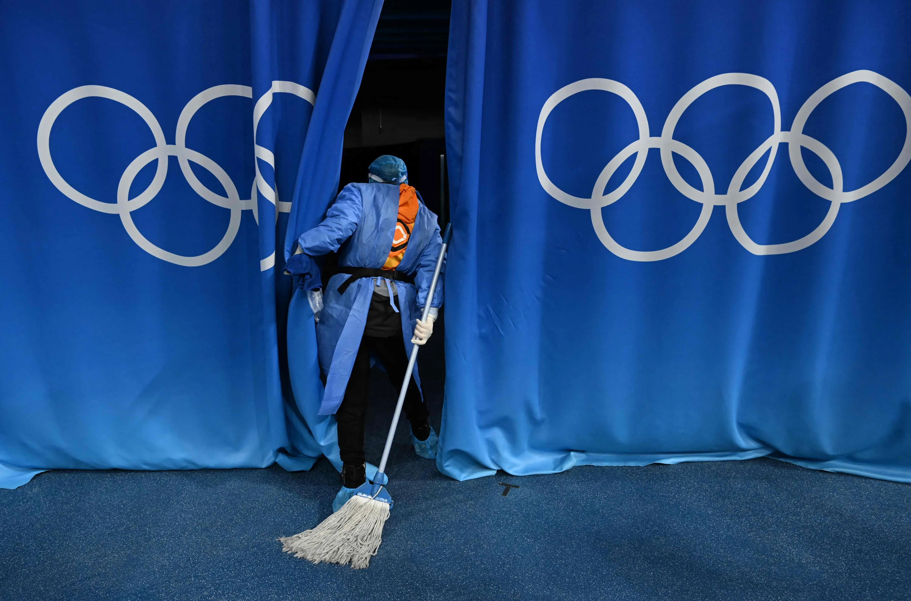 A worker looks behind curtains before the women's play-offs semifinal match of the Beijing 2022 Winter Olympic Games ice hockey competition between USA and Finland, at the Wukesong Sports Centre in Beijing on February 14, 2022. (Photo by Kirill Kudryavtsev/AFP Photo)