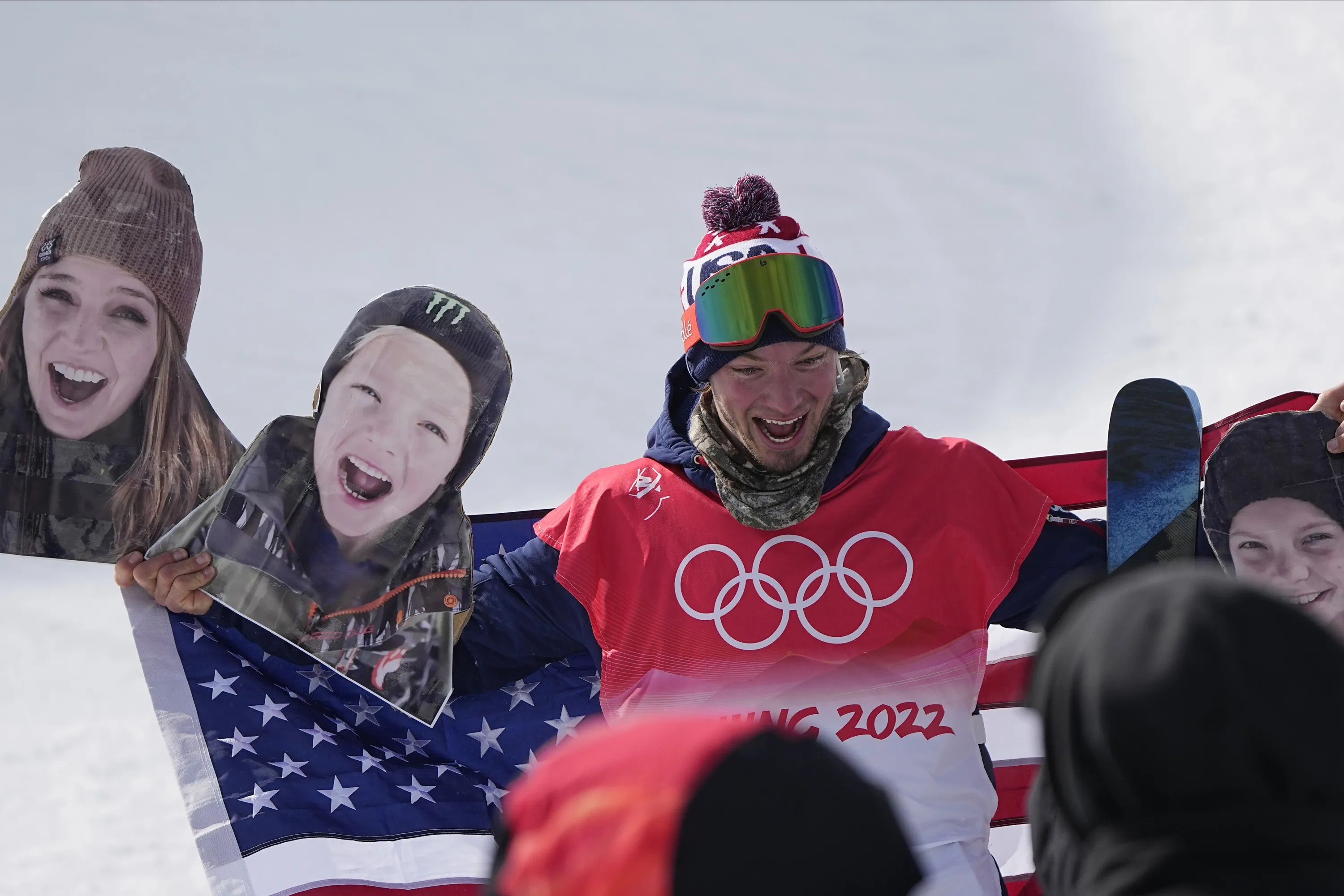 Silver medal winner United States' David Wise celebrates after the venue award ceremony for the men's halfpipe at the 2022 Winter Olympics, Saturday, February 19, 2022, in Zhangjiakou, China. (Photo by Gregory Bull/AP Photo)