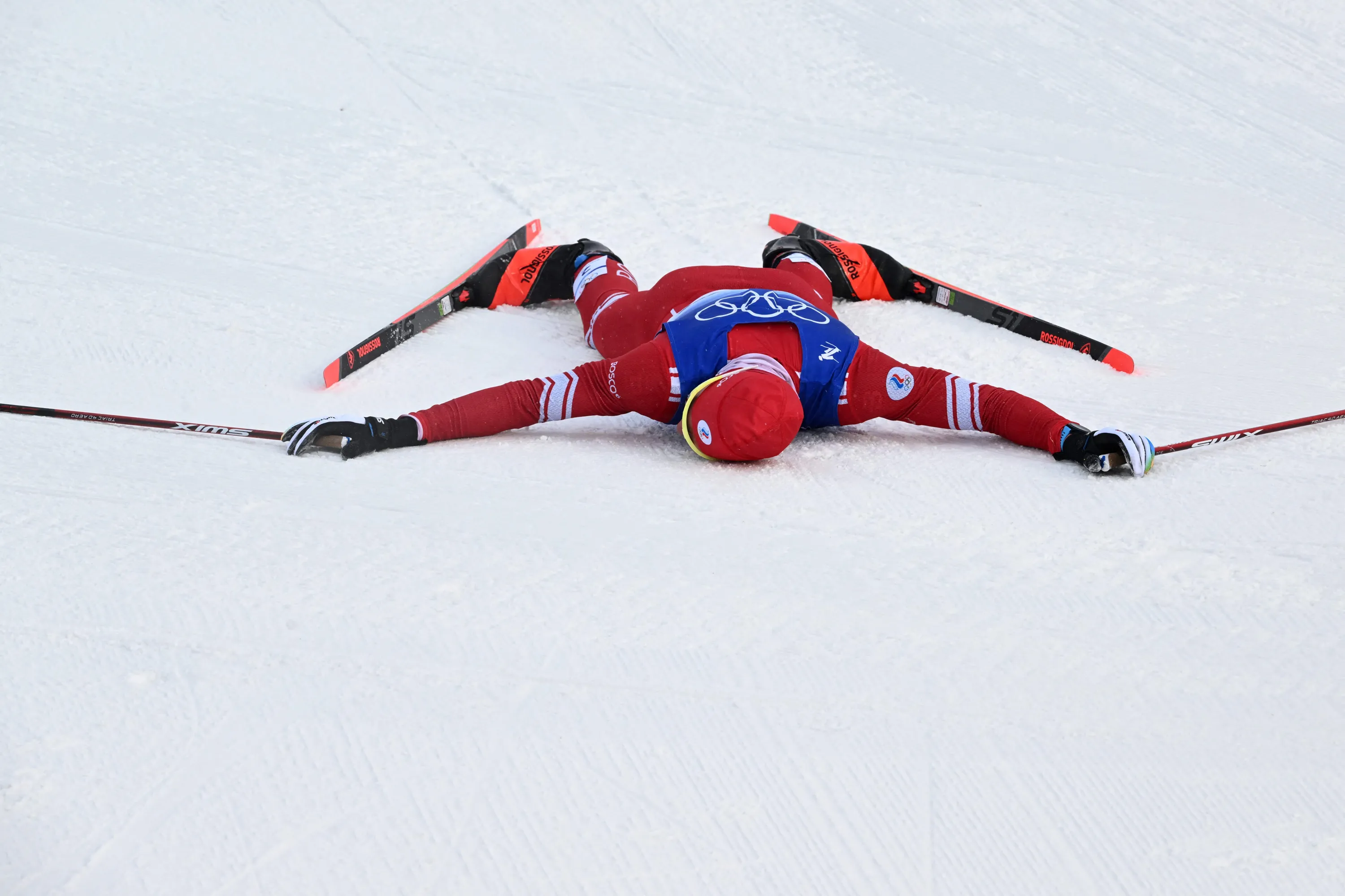 Russia's Alexander Bolshunov reacts after crossing the finish to win Gold in the men's 50km mass start free event, which was shortened to 30km due to high winds, on February 19, 2022 at the Zhangjiakou National Cross-Country Skiing Centre, during the Beijing 2022 Winter Olympic Games. (Photo by Christof Stache/AFP Photo)