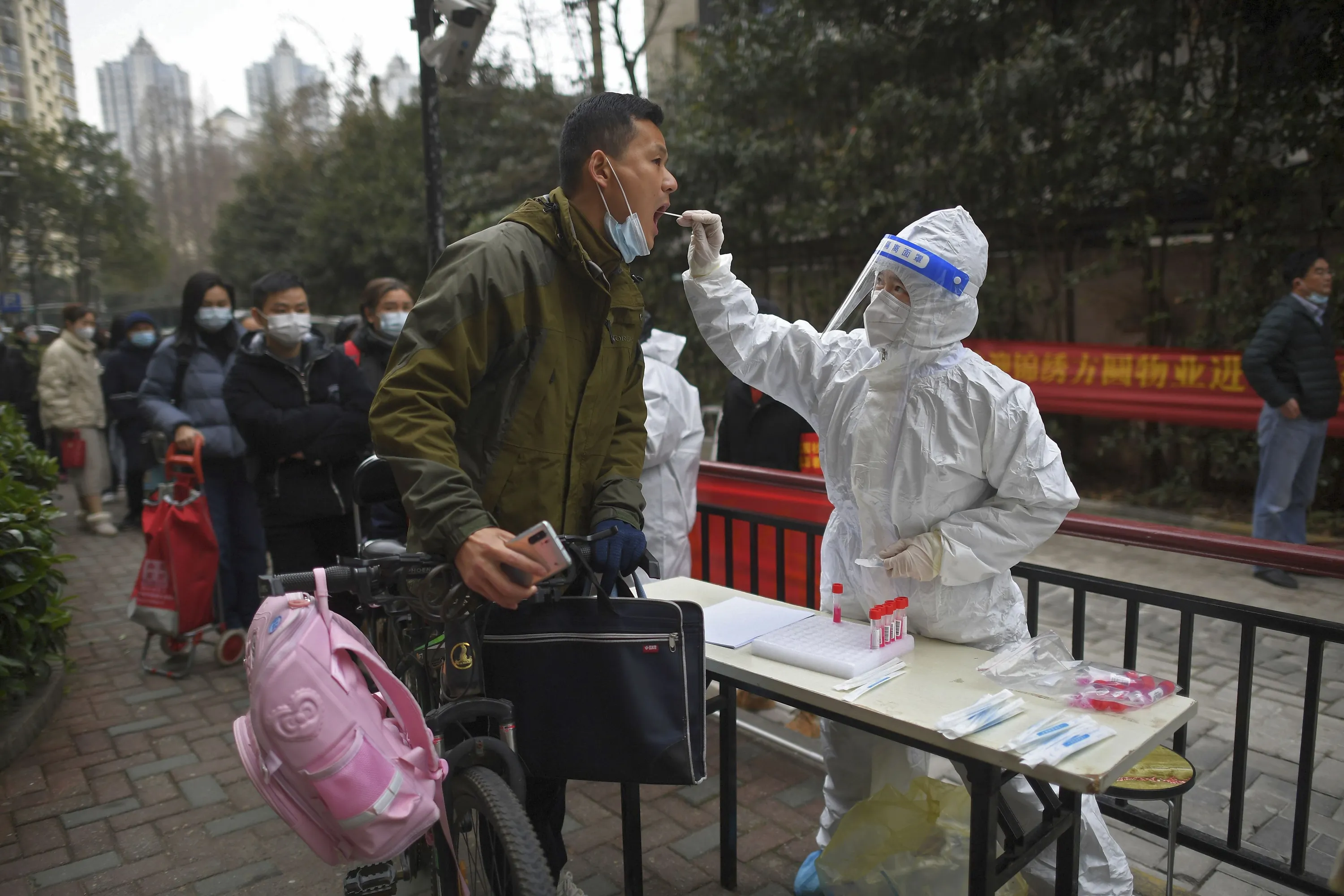 A man holding his bicycle with a school bag on it gets a throat swab during a mass COVID-19 test at a residential compound in Wuhan in central China's Hubei province, Tuesday, February 22, 2022. Wuhan, the first major outbreak of the coronavirus pandemic has reported more than dozen new coronavirus cases this week, prompting the authority to step up precautious measures. (Photo by Chinatopix via AP Photo)