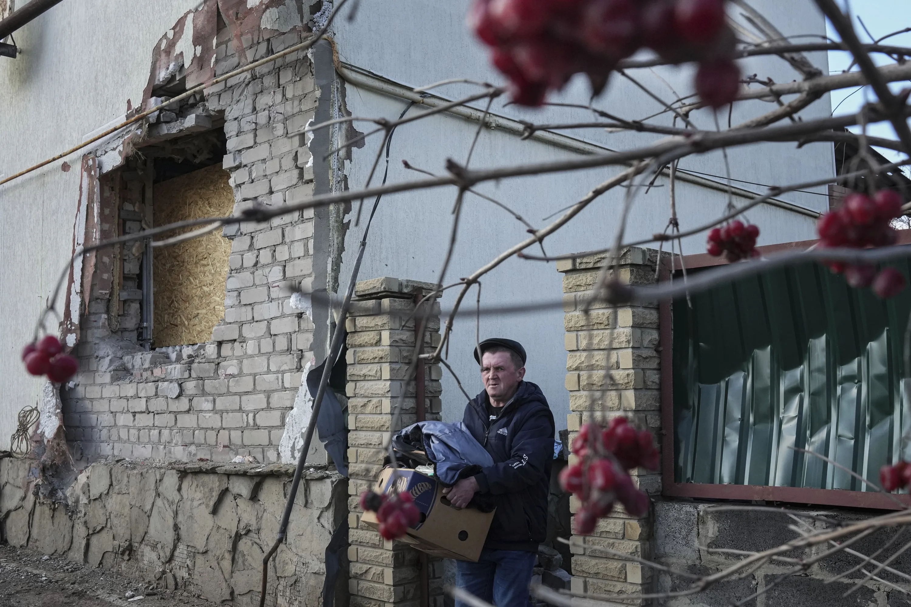 A man takes his things out of the house after damaged by artillery shelling in Novoluhanske, eastern Ukraine, Wednesday, February 23, 2022. U.S. President Joe Biden announced the U.S. was ordering heavy financial sanctions against Russia, declaring that Moscow had flagrantly violated international law in what he called the “beginning of a Russian invasion of Ukraine”. (Photo by Evgeniy Maloletka/AP Photo)