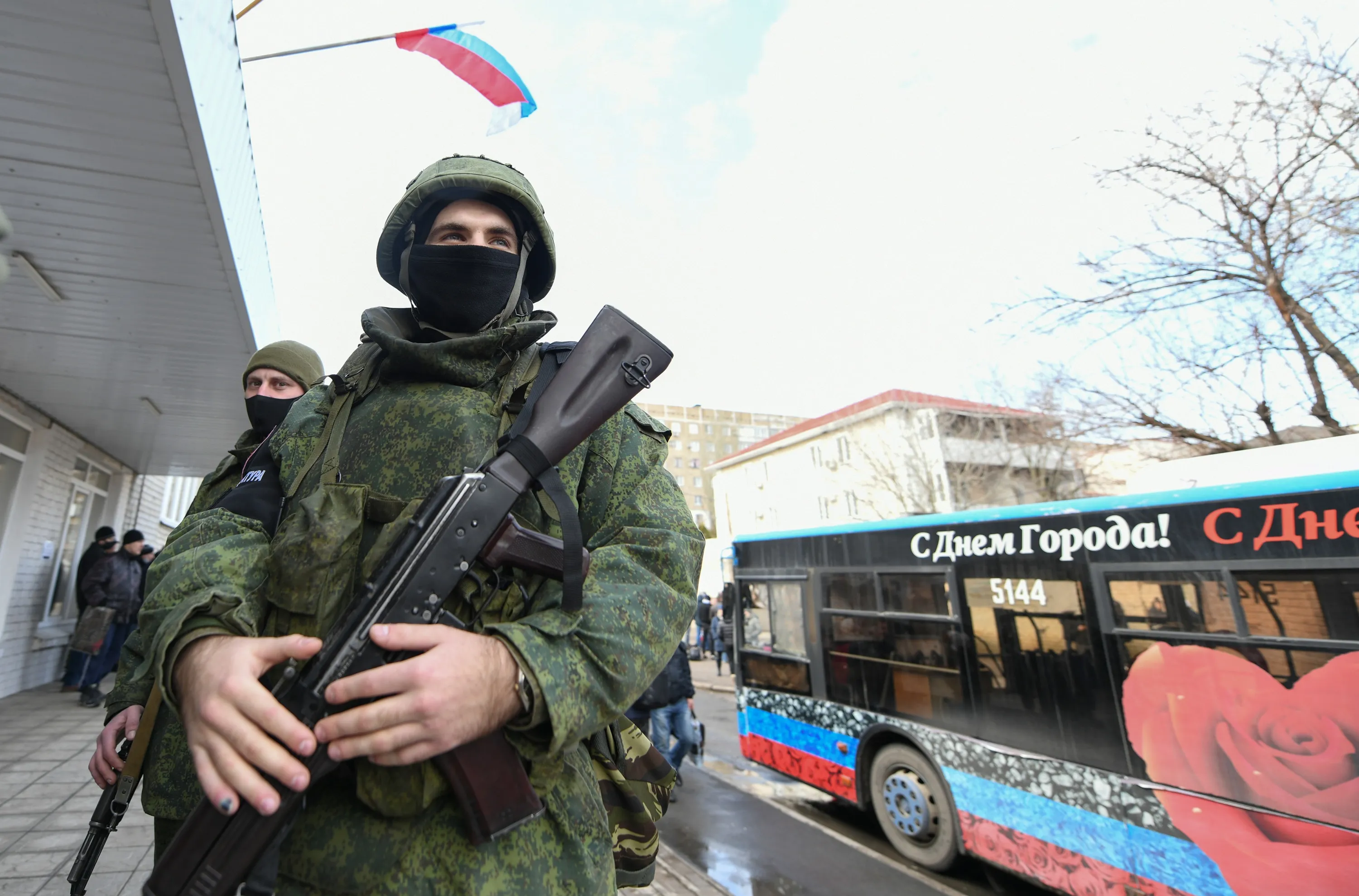 People arrive at recruiting office to register themselves after declaration of mobilization in the Donetsk region under the control of pro-Russian separatists, on February 23, 2022. (Photo by Stringer/Anadolu Agency via Getty Images)