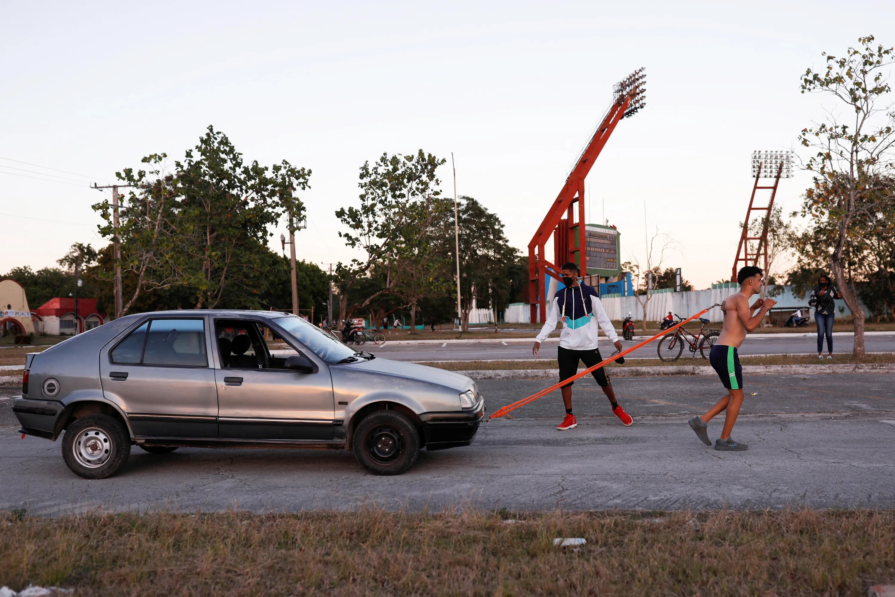 Christian Emanuel Castellanos Rangel, 22, pulls a car with a makeshift wood piece to tighten his scapulas during a training session in Sancti Spiritus, Cuba, January 30, 2022. Christian Enmanuel claims to have broken the world record for heaviest vehicle pulled with the shoulder blades. Using a block of wood gripped between his scapulas, he pulled a car weighing 1,100kg – the Guinness world record, set in India in 2016, is 1,070kg. (Photo by Amanda Perobelli/Reuters)