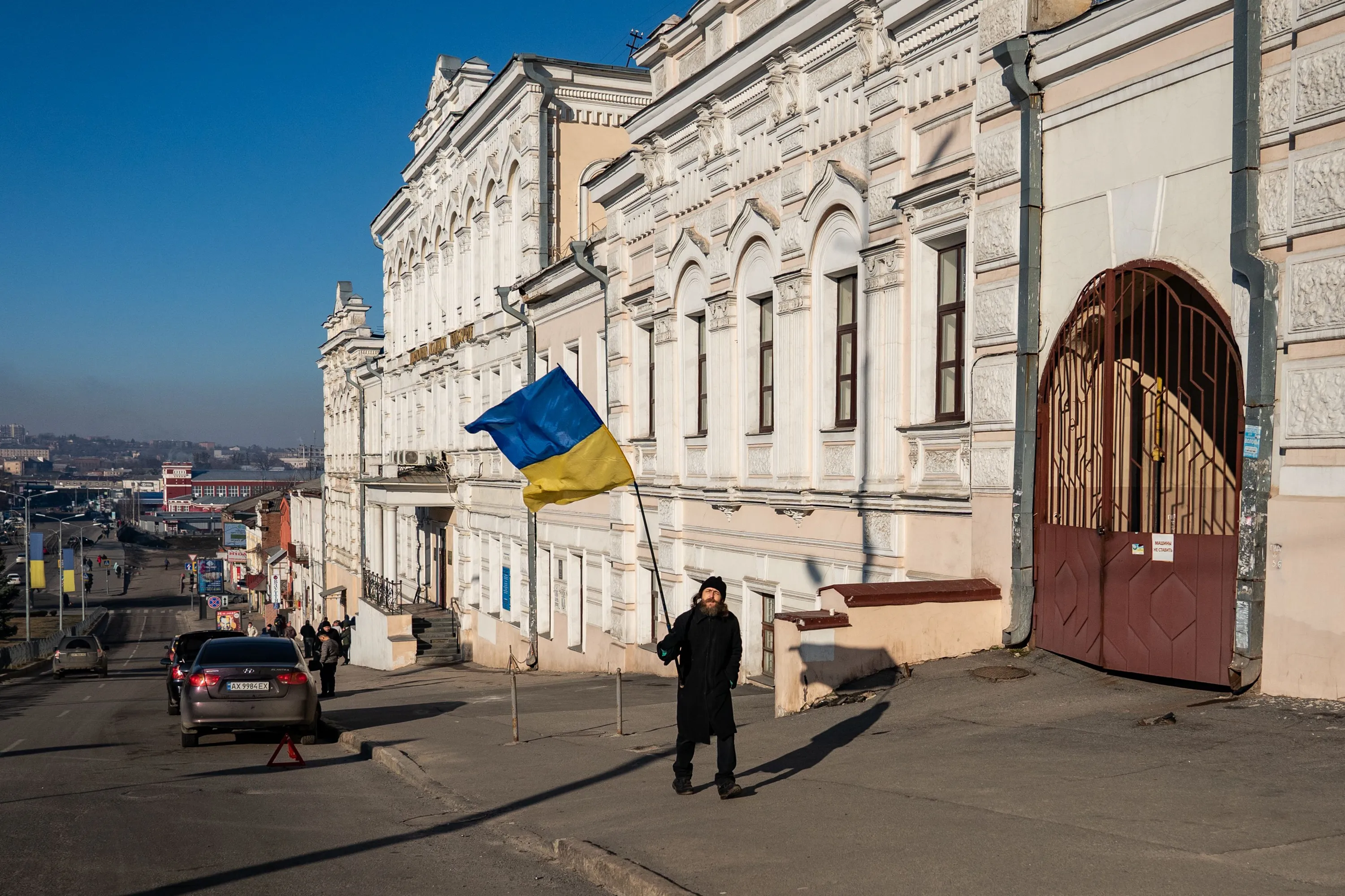 A man waves a Ukraine flag in downtown in Kharkiv, Ukraine, Thursday, February 24, 2022. (Photo by Salwan Georges/The Washington Post)