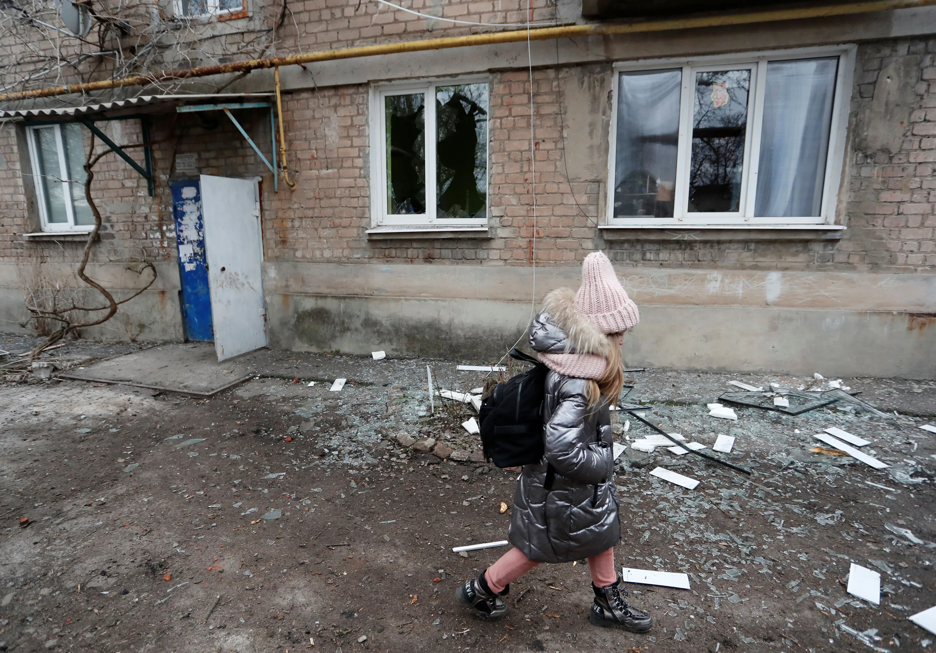 A girl walks past an apartment building, which locals said was damaged by recent shelling, in the separatist-controlled town of Yasynuvata (Yasinovataya) in the Donetsk region, Ukraine on February 24, 2022. (Photo by Alexander Ermochenko/Reuters)