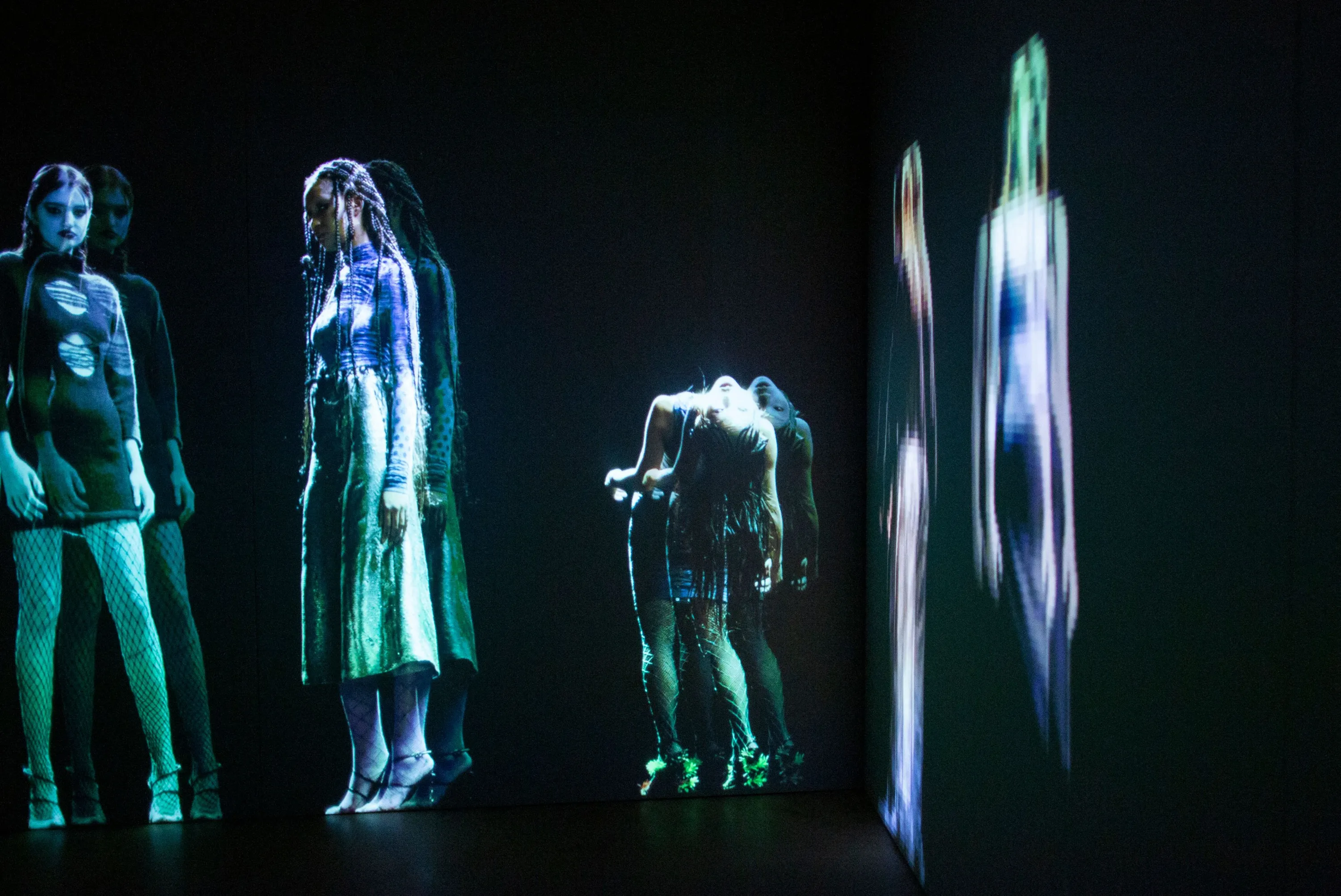 Holograms display creations by designer Maisie Wilen during New York Fashion Week: The Shows, in New York City on February 12, 2022. The show features 28 seven-foot-tall augmented reality hologram models. (Photo by Kena Betancur/AFP Photo)