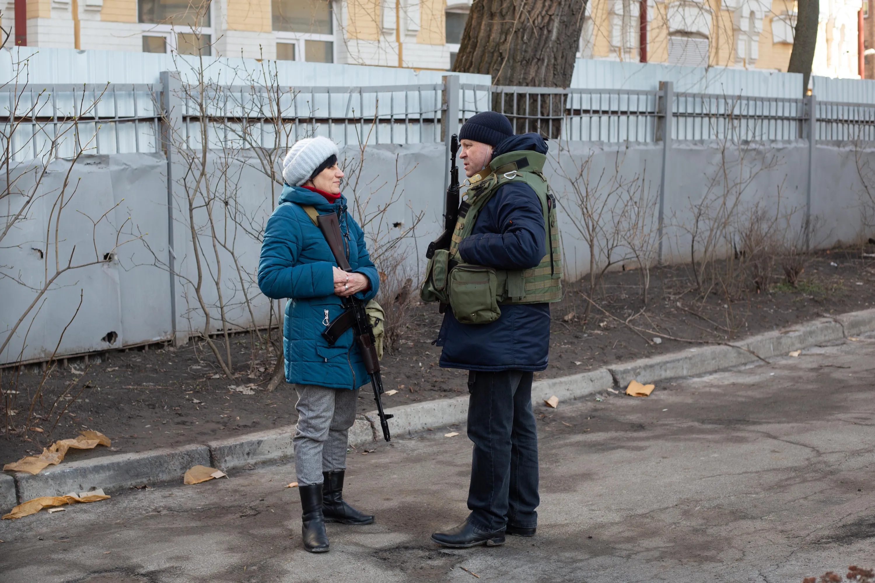 Members of the territorial defense are seen near the recruitment office in Kyiv on February 25, 2022, Ukraine. Yesterday, Russia began a large-scale attack on Ukraine, with Russian troops invading the country from the north, east and south, accompanied by air strikes and shelling. The Ukrainian president said that at least 137 Ukrainian soldiers were killed by the end of the first day. (Photo by Anastasia Vlasova/Getty Images)
