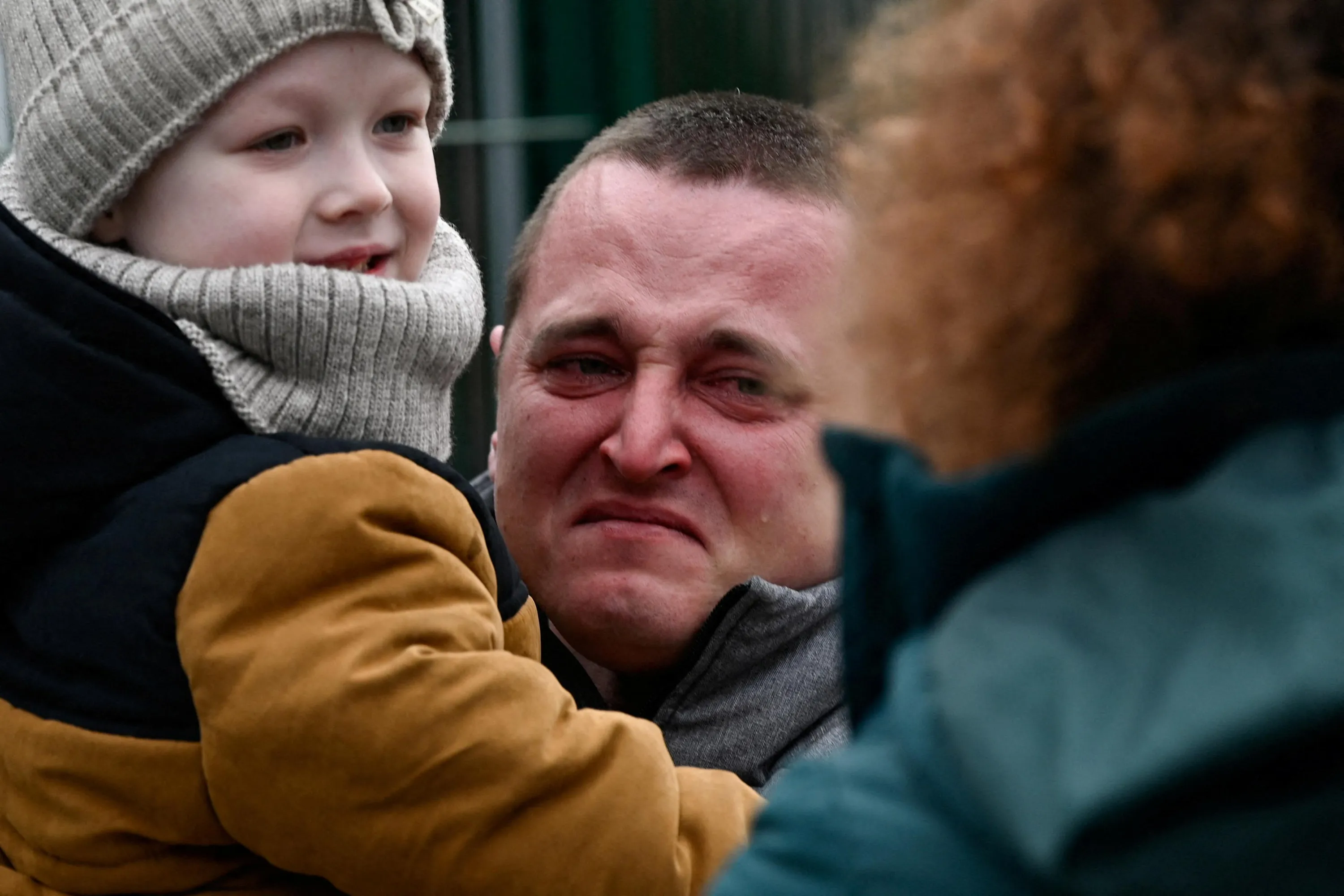 A man holding a child reacts as they arrive from Ukraine to Slovakia, after Russia launched a massive military operation against Ukraine, in Ubla, Slovakia, February 25, 2022. (Photo by Radovan Stoklasa/Reuters)