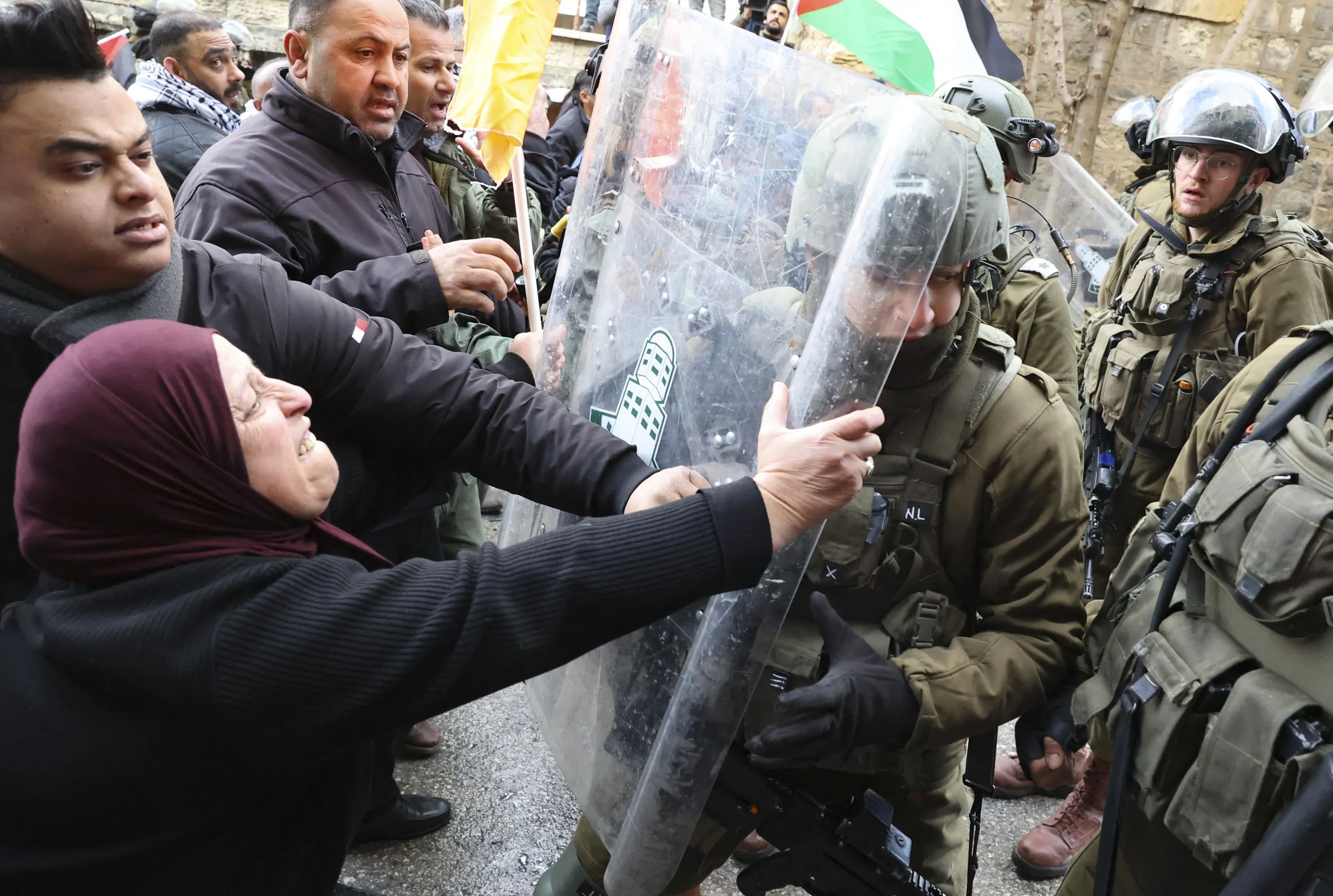 A Palestinian woman confronts members of the Israeli security forces during clashes with them following a demonstration to commemorate the 1994 Ibrahimi Mosque massacre, in the centre of the West Bank town of Hebron, on February 25, 2022. (Photo by Hazem Bader/AFP Photo)