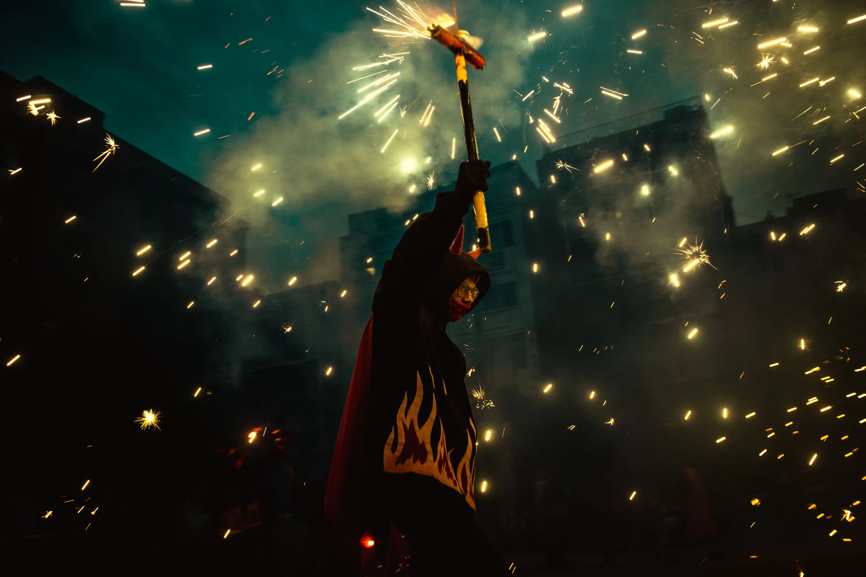Fire runners of the “Diables Vell de la Gracia” group dance to traditional drums under fireworks celebrating their 40th anniversary, but without the traditional involvement of the public due to CORONA-19 measures in Barcelona, Spain on June 5, 2021. (Photo by Matthias Oesterle/Zuma Wire/Rex Features/Shutterstock)