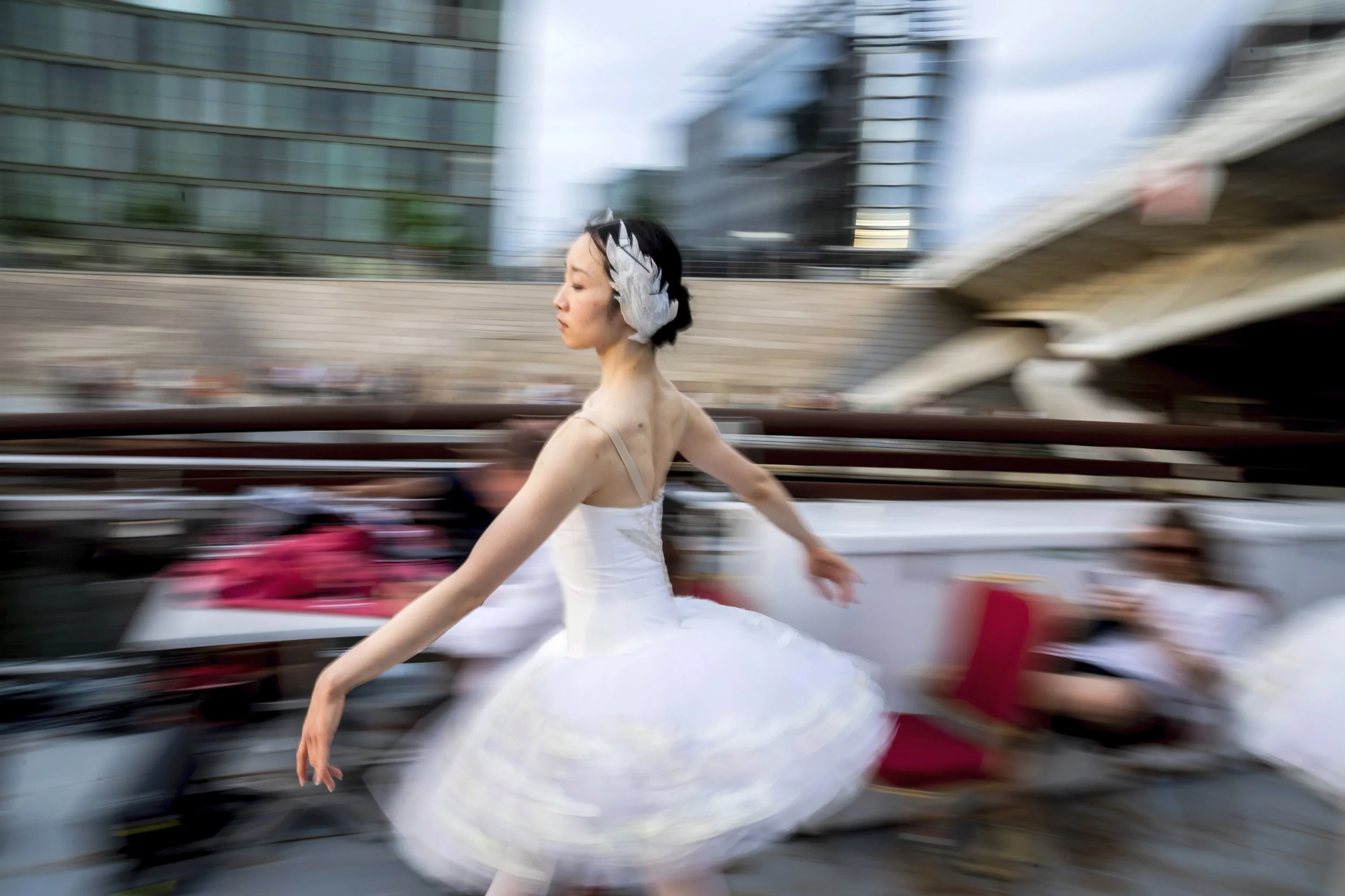 A dancer from the Berlin State Ballet dances “Swan Lake” on an excursion boat during a tour of the city centre in Berlin, Germany on June 10, 2021. The performance was followed by numerous people along the route. (Photo by Christoph Soeder/dpa)