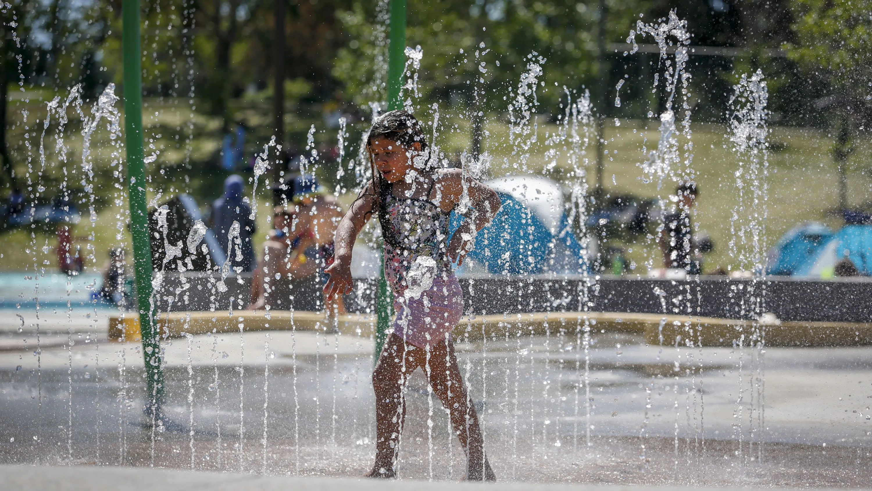 A young girl runs through a fountain at a splash park trying to beat the heat in Calgary, Alberta, Wednesday, June 30, 2021. Environment Canada warns the torrid heat wave that has settled over much of Western Canada won't lift for days. (Photo by Jeff McIntosh/The Canadian Press via AP Photo)