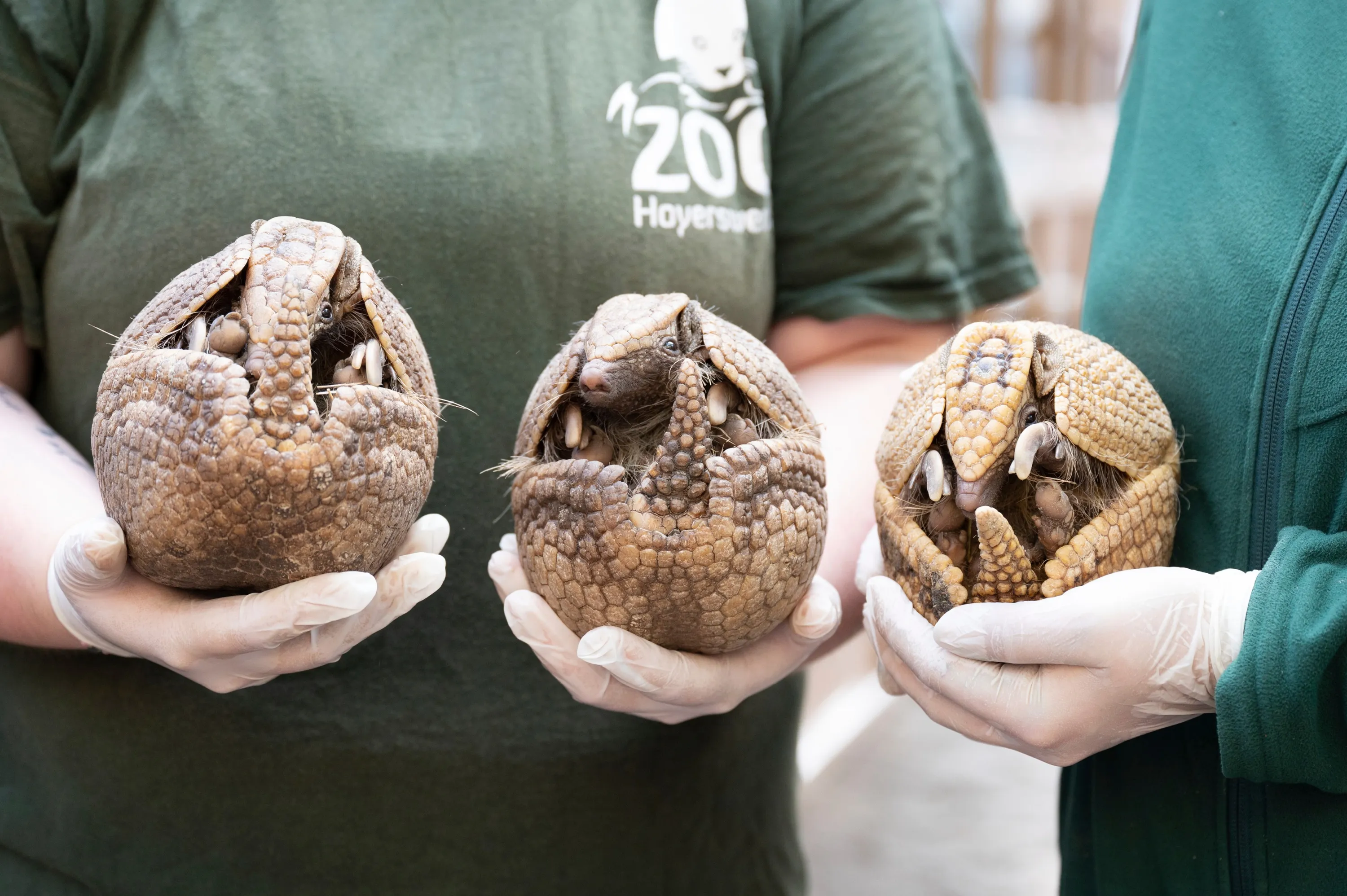 Two animal keepers hold a family of armadillos as part of the inventory at Hoyerswerda Zoo in Saxony on February 10, 2022. (Photo by Sebastian Kahnert/dpa-Zentralbild/dpa)