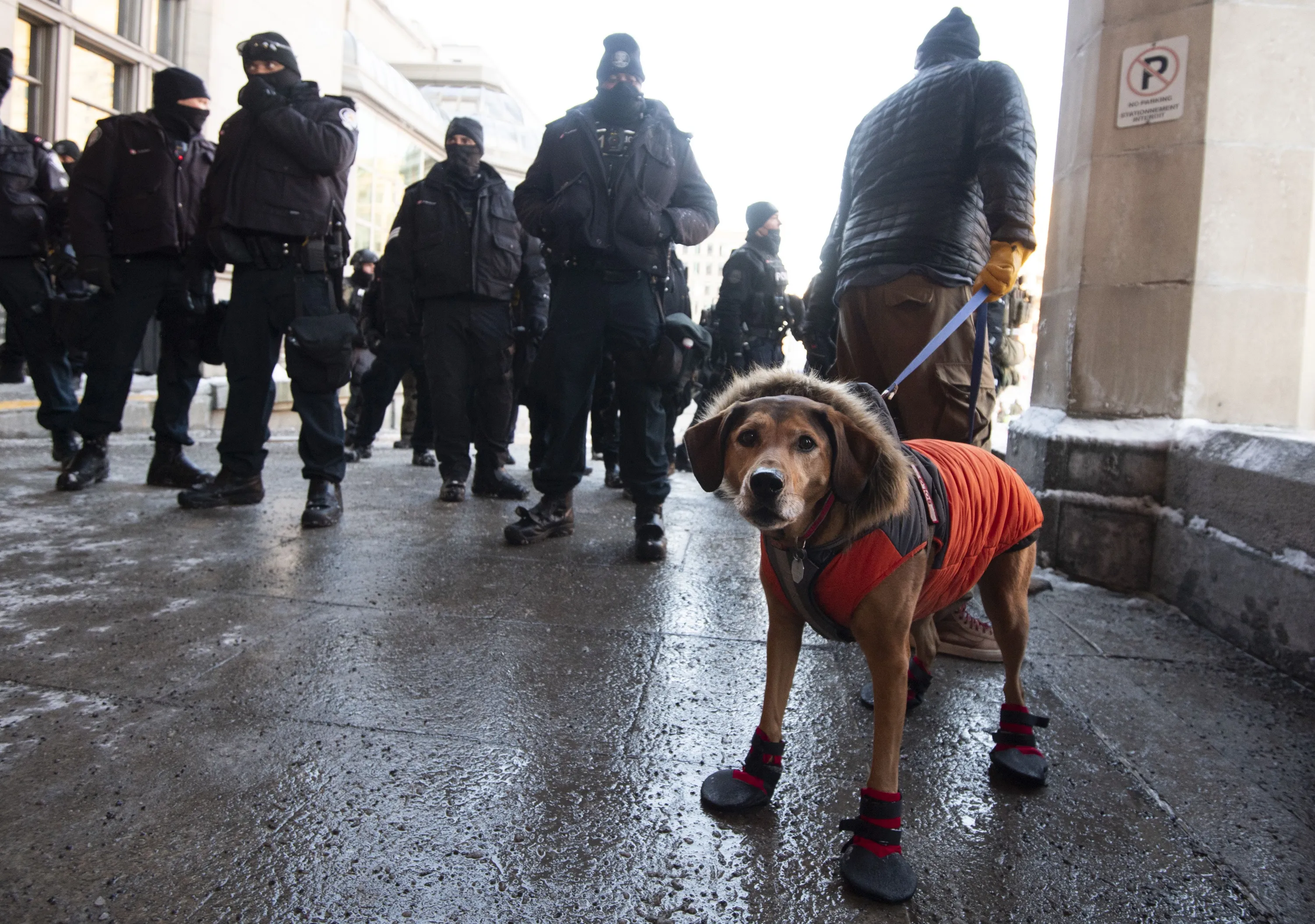 A protester with a dog speaks to police officers as they tighten a perimeter at the Chateau Laurier hotel as they aim to end an ongoing protest against COVID-19 measures that has grown into a broader anti-government demonstration and occupation in Ottawa, Ontario, Friday, February 18, 2022. (Photo by Justin Tang/The Canadian Press via AP Photo)