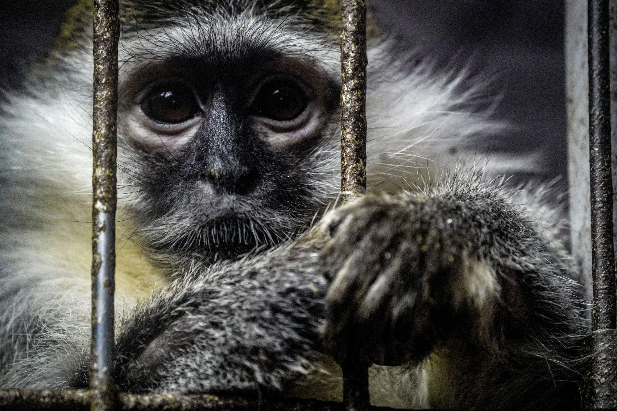 A monkey is seen at a center established for the rehabilitation of wild animals in the village of Andreikovo of Moscow, Russia on January 28, 2022. The animals, whose rehabilitation and health checks are completed, are released into nature. (Photo by Pelagiya Tikhonova/Anadolu Agency via Getty Images)