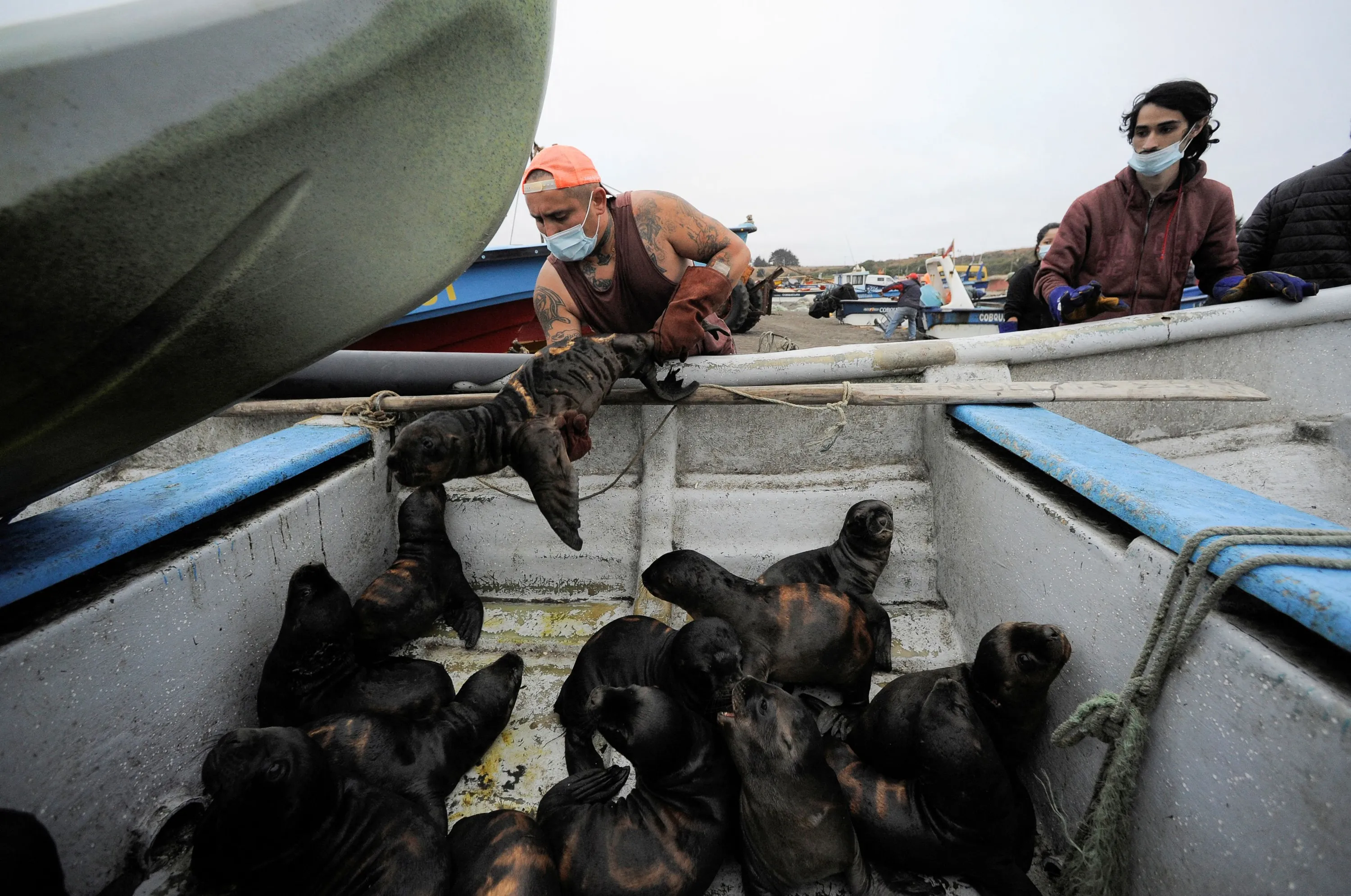 A volunteer places a sea lion pup into a boat with others after they fell into the ocean, before they are being released back to a rock and sanctuary for a herd of sea lions, in Cobquecura, Chile on February 3, 2022. (Photo by Jose Luis Saavedra/Reuters)
