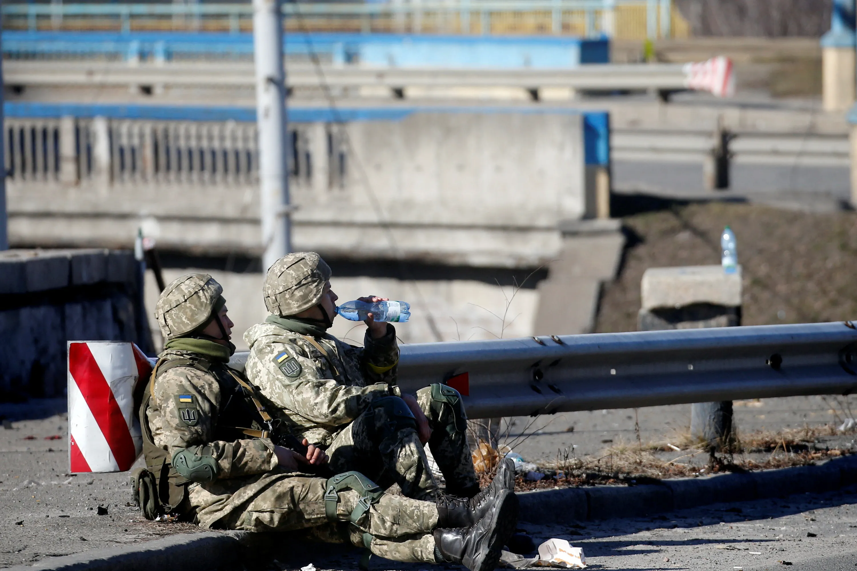 Ukrainian service members rest following a night fight, after Russia launched a massive military operation against Ukraine, in Kyiv, Ukraine on February 26, 2022. (Photo by Valentyn Ogirenko/Reuters)