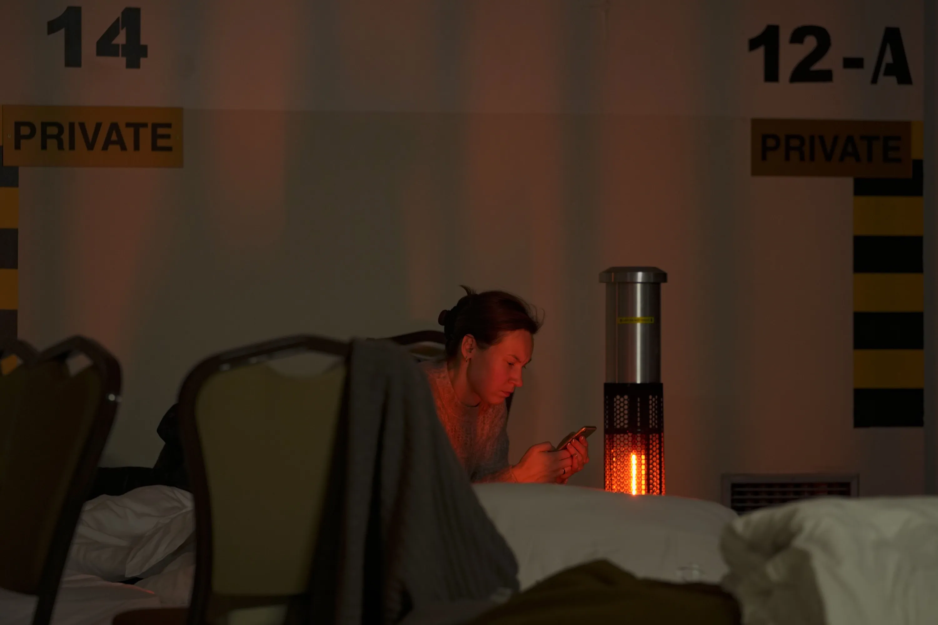 A woman looks at her mobile phone in a hotel underground parking turned into a bomb shelter during an air raid alert in Kyiv, Ukraine, Sunday, February 27, 2022. Terrified men, women and children sought safety inside and underground, and the government maintained a 39-hour curfew to keep people off the streets as more than 150,000 Ukrainians fled to neighboring countries and the United Nations warned the number could grow to 4 million if fighting escalates. (Photo by Vadim Ghirda/AP Photo)