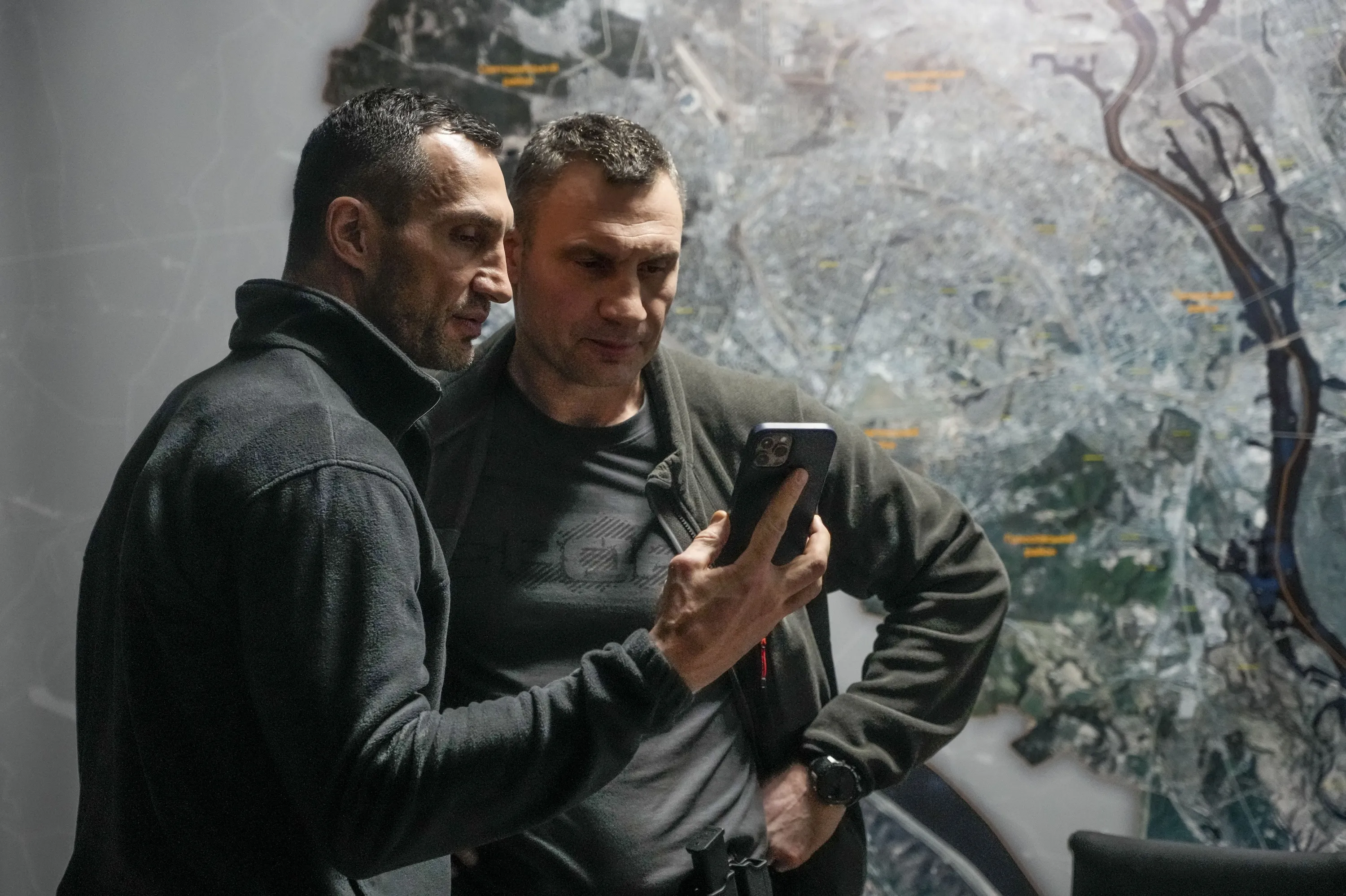 Vitali Klitschko, Kyiv Mayor and former heavyweight champion, right, and his brother Wladimir Klitschko, a Ukrainian former professional boxer look at a smart phone in the City Hall in Kyiv, Ukraine, Sunday, February 27, 2022. (Photo by Efrem Lukatsky/AP Photo)