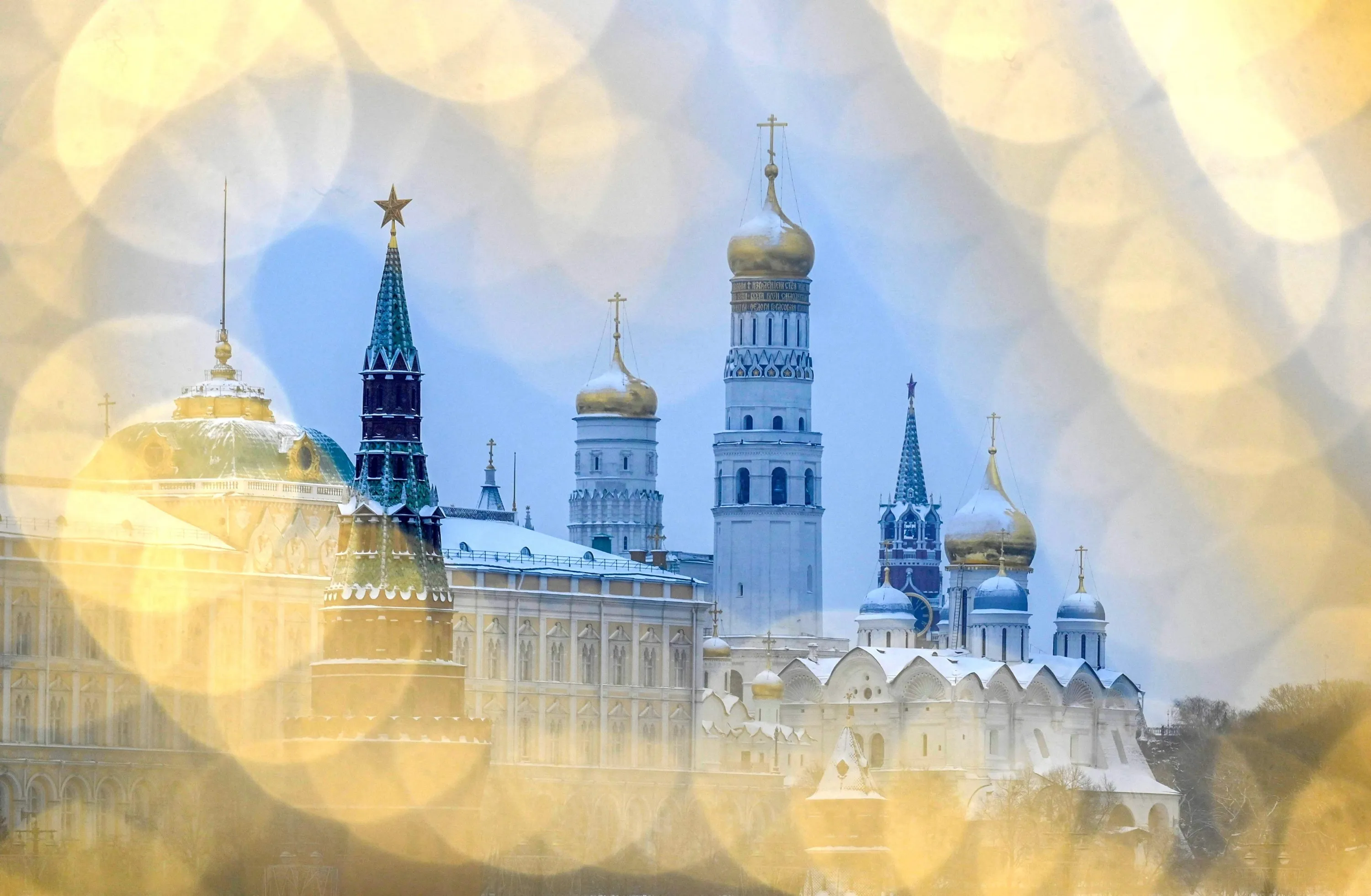 A picture taken in Moscow on February 1, 2022 shows Vodovzvodnaya tower (L) and Ivan the Great bell tower (R) in the Kremlin through illumination . (Photo by Natalia Kolesnikova/AFP Photo)