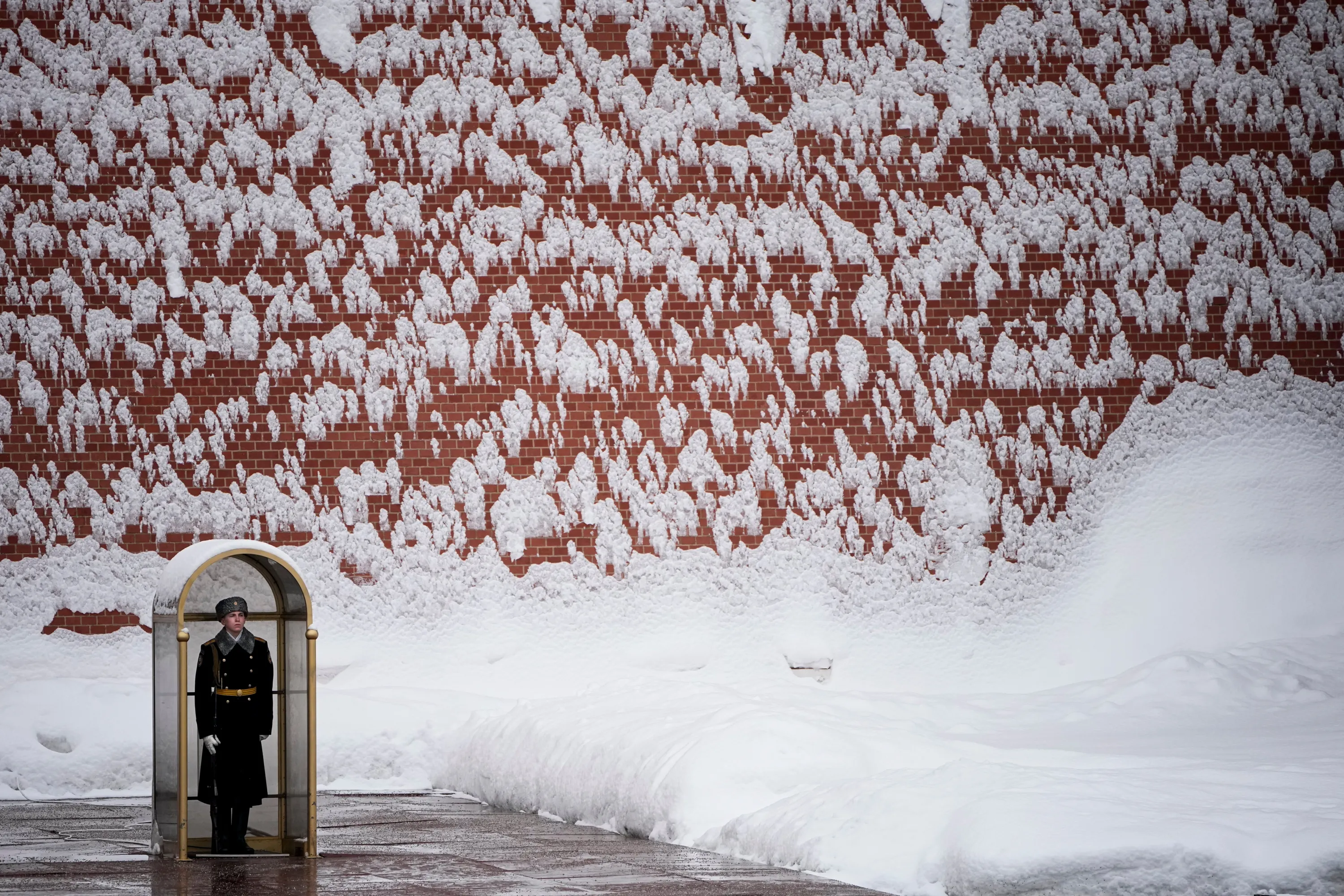 A soldier of the Kremlin guard stands at the Tomb of Unknown Soldier at the Kremlin Wall after a snowfall in Moscow, Russia, Monday, February 7, 2022. (Photo by Alexander Zemlianichenko/AP Photo)