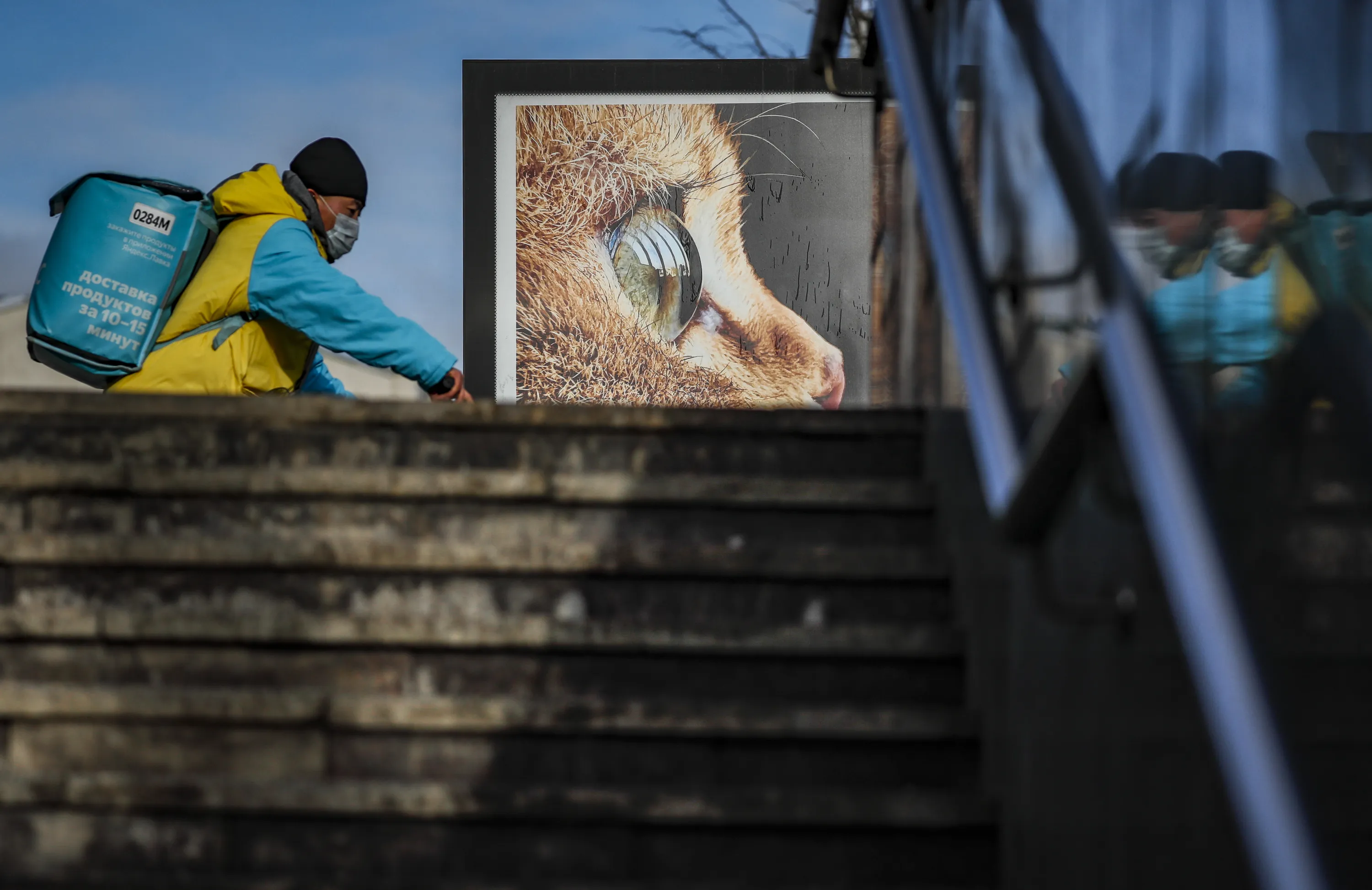 A delivery food man wearing a protective face mask cycles on the street during the COVID-19 pandemic in Moscow, Russia, 09 February 2022. According to the national coronavirus information center, over the past 24 hours, a record number of 183,103 cases of the coronavirus infection have been detected in Russia. (Photo by Yuri Kochetkov/EPA/EFE)