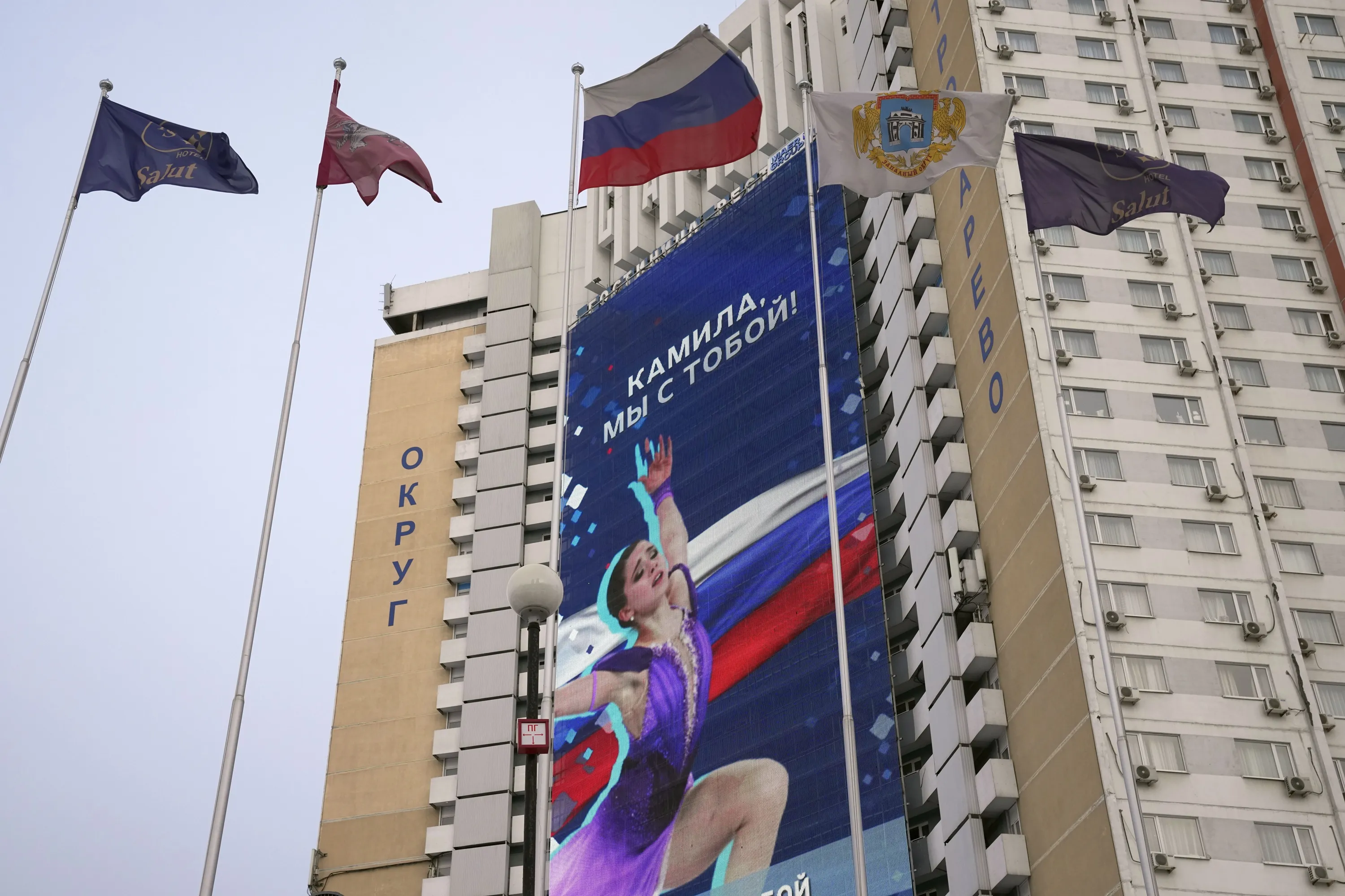 A huge electronic billboard shows a photo of Kamila Valieva with words “Kamila, we are with you” on the building of the Salut hotel in Moscow, Russia, Monday, February 14, 2022. Russian teenager Kamila Valieva has been cleared to compete in the women's figure skating competition at the Winter Olympics despite failing a pre-Games drug test. (Photo by Alexander Zemlianichenko/AP Photo)