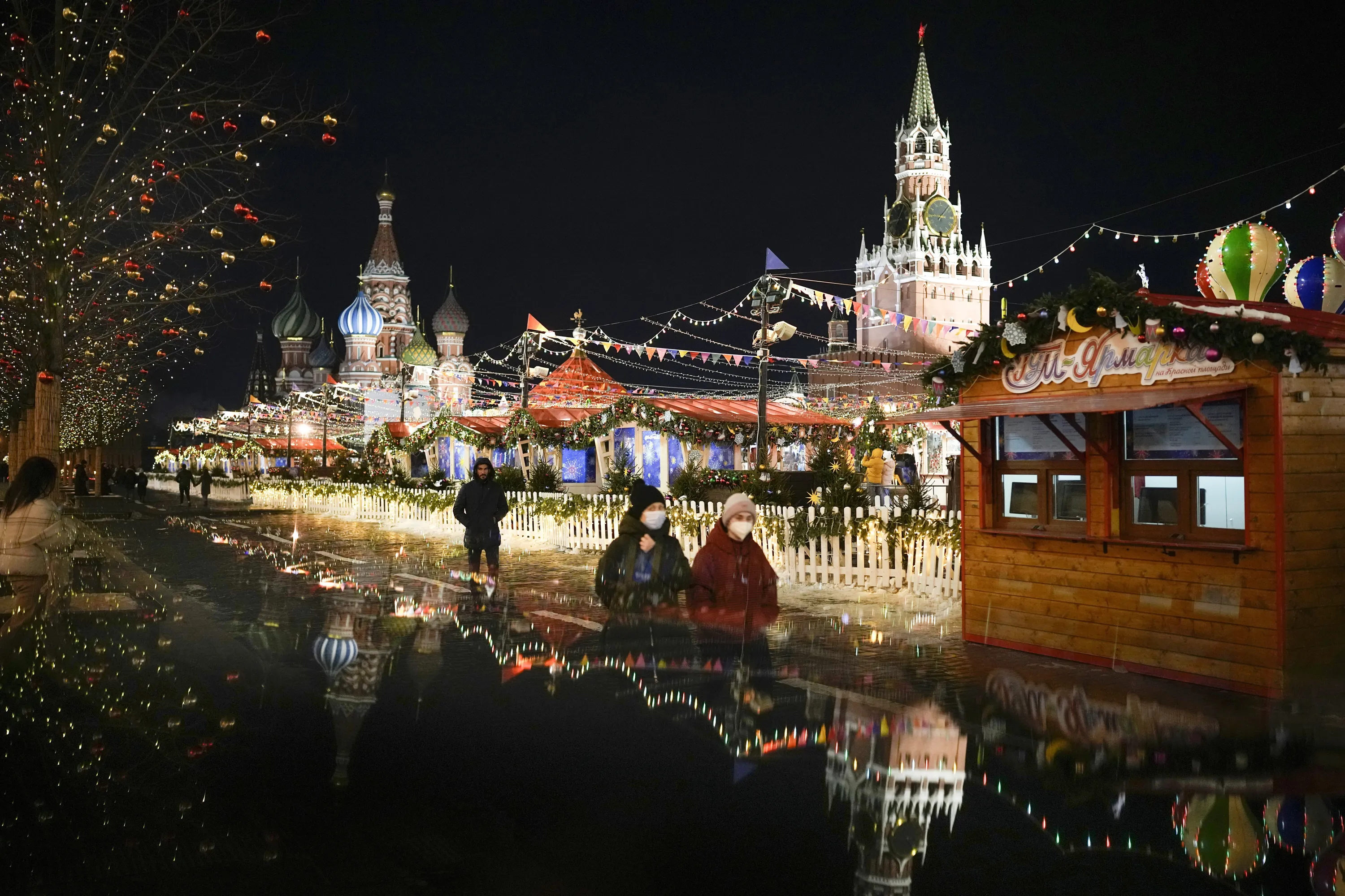 People walk past a Market set up in Red Square with the St. Basil's Cathedral, left, and the Spasskaya Tower, right, in Moscow, Russia, late Monday, February 14, 2022. (Photo by Alexander Zemlianichenko/AP Photo)
