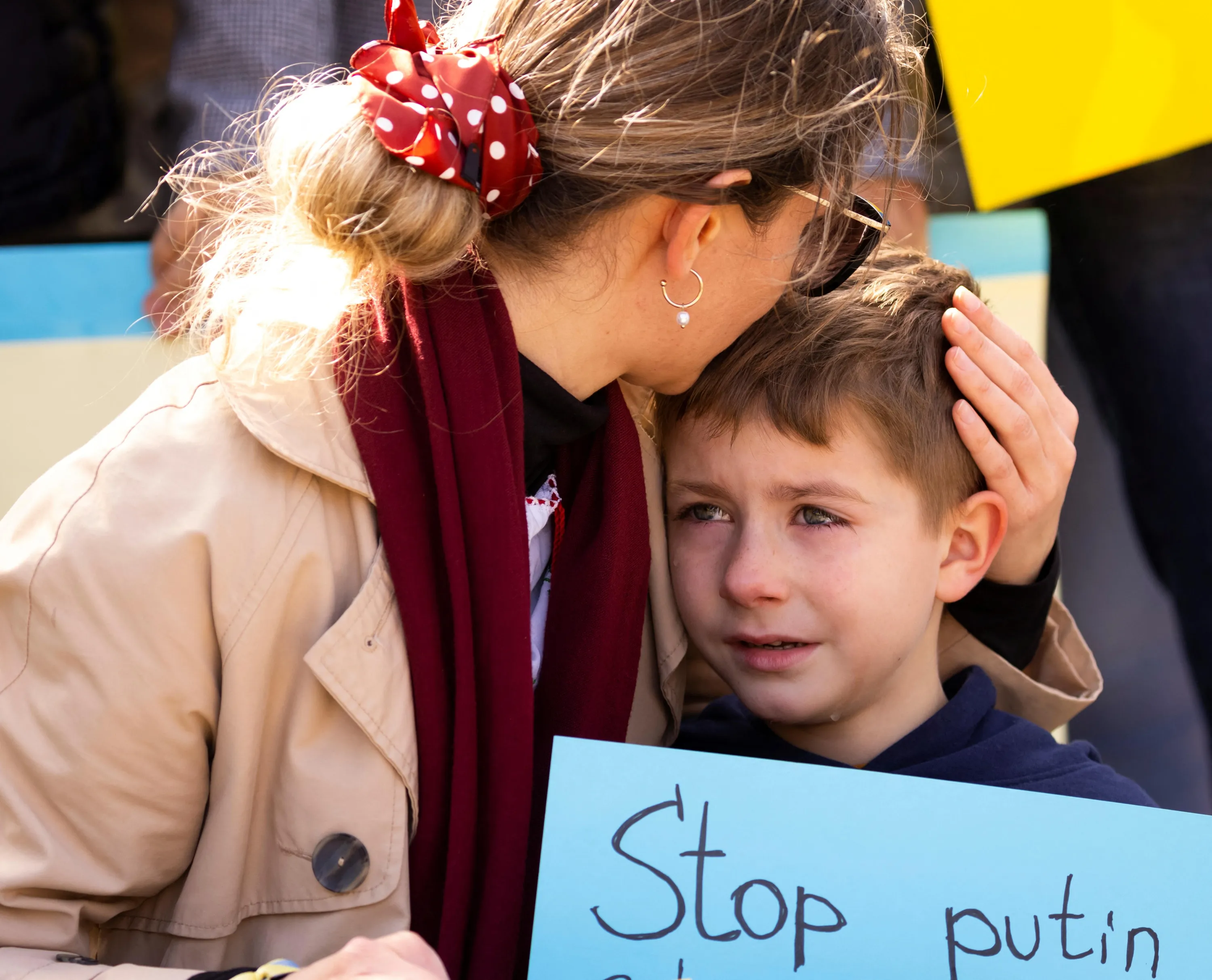 A woman tries to comfort a crying child as Ukrainian nationals living in Malta along with Maltese supporters attend a protest against the Russian invasion of Ukraine, in Valletta, Malta, February 26, 2022. (Photo by Darrin Zammit Lupi/Reuters)