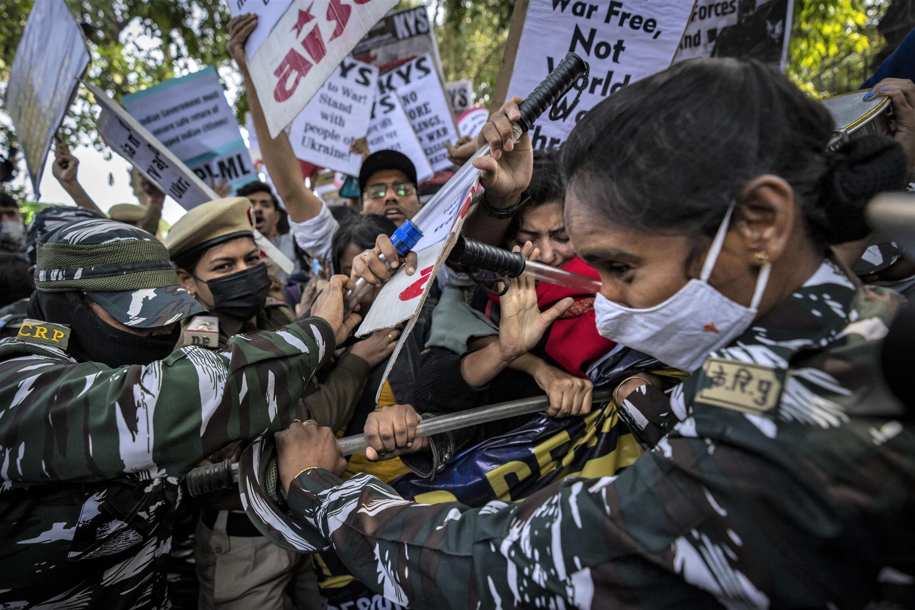 Student activists are restrained by police as they tried to march during a protest against Russian offensive on Ukraine, in New Delhi, India, Saturday, February 26, 2022. As the fighting continued in Ukraine, several organizations held protest demonstrations in the Indian capital for a second day on Saturday, demanding an end to the Russian aggression and pressing the Indian government to evacuate thousands of Indians, mostly students, stranded there. (Photo by Altaf Qadri/AP Photo)