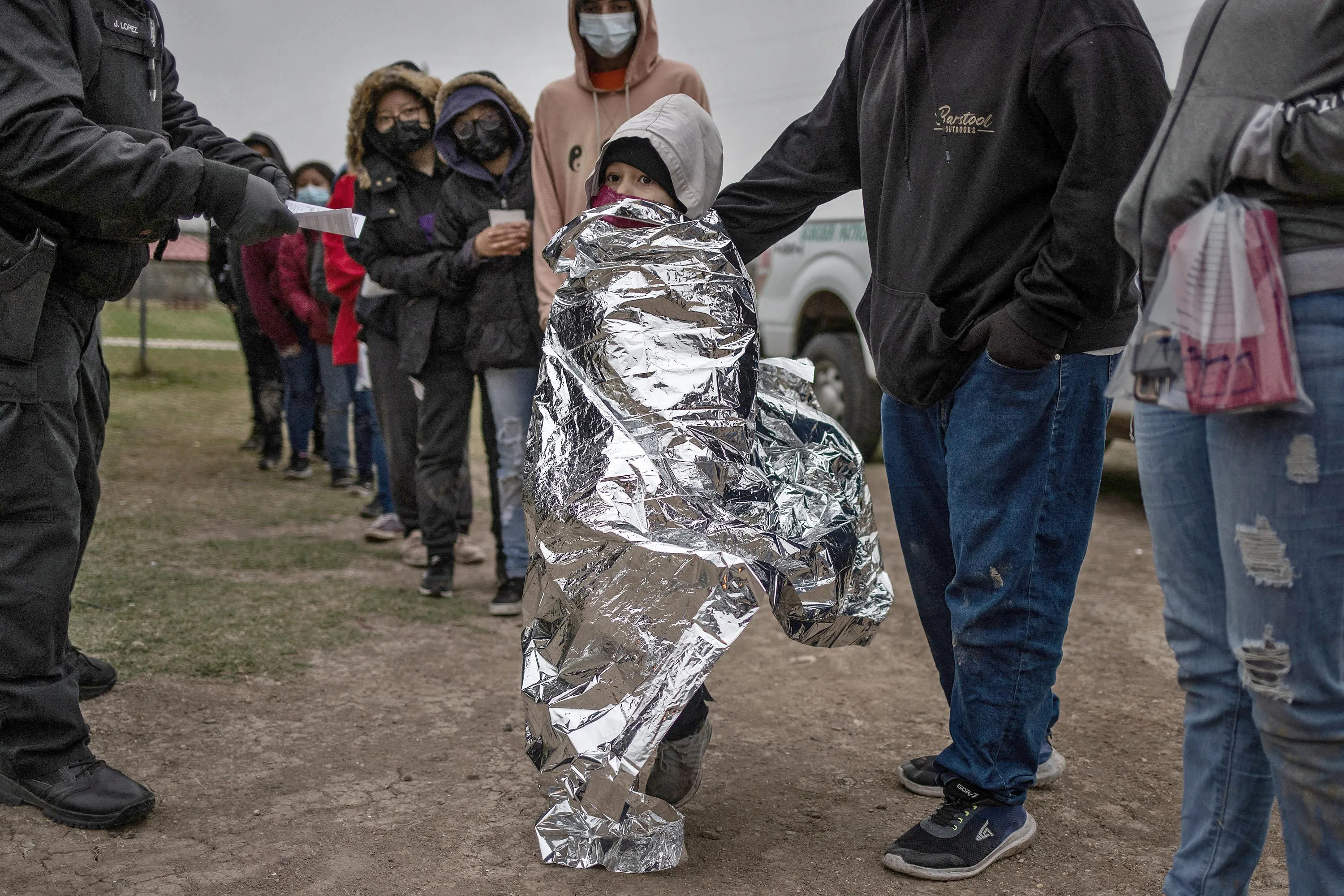 Nelli, a six year old unaccompanied migrant girl from Honduras, stands wrapped in an emergency blanket as she is asked by a Customs and Border Protection official to board a bus after she and others crossed the Rio Grande river into the United States from Mexico, in La Joya, Texas, U.S., February 23, 2022. Nearly a dozen unaccompanied children, who were seeking asylum from El Salvador, Guatemala, Honduras and Nicaragua, were supplied blankets as a cold front dropped temperatures to a blustery 43 Fahrenheit (6.1 Celsius). (Photo by Adrees Latif/Reuters)