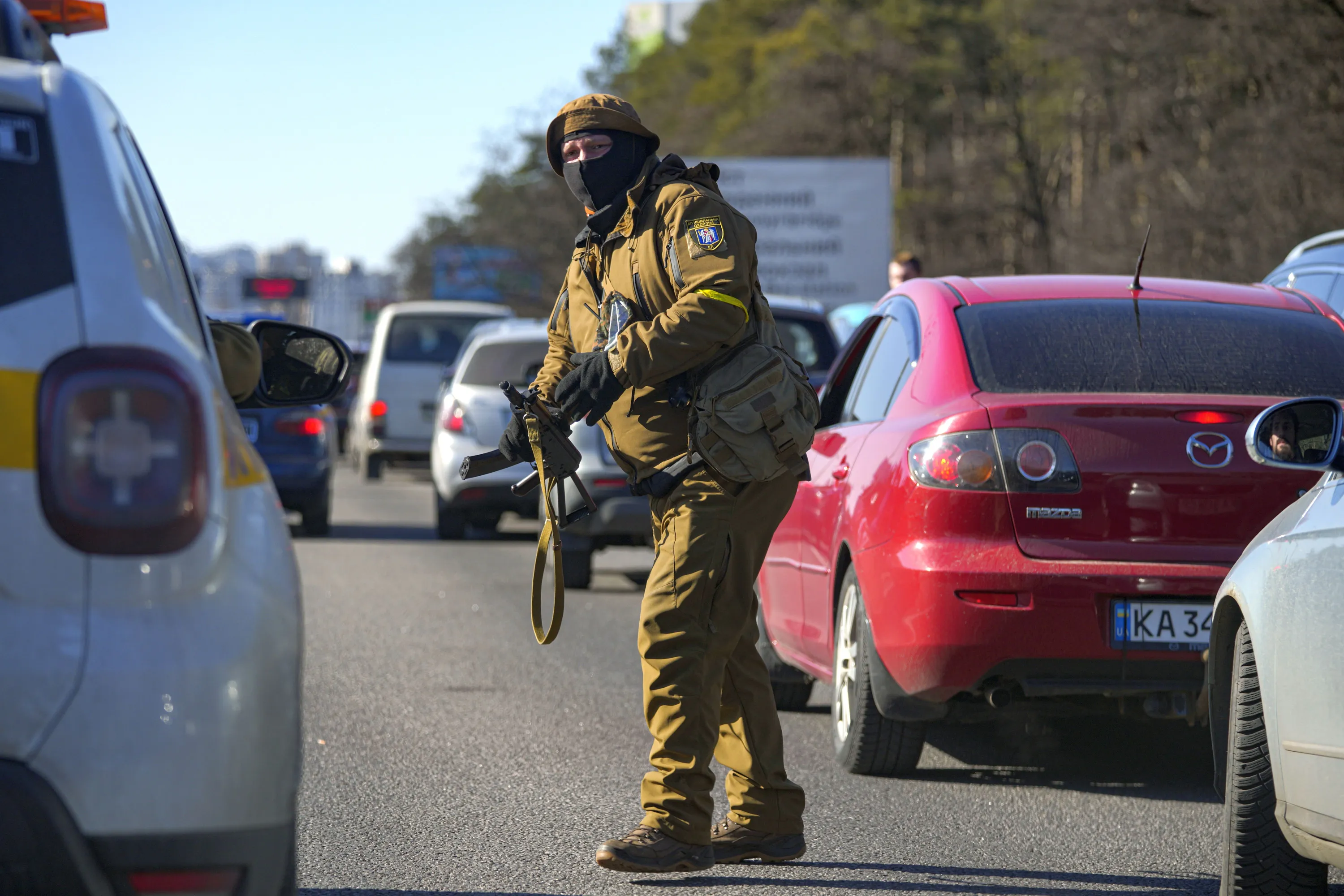 A member of the Ukrainian territorial defense directs cars in a traffic jam ahead of a military checkpoint outside Kyiv, Ukraine, Monday, February 28, 2022. (Photo by Vadim Ghirda/AP Photo)