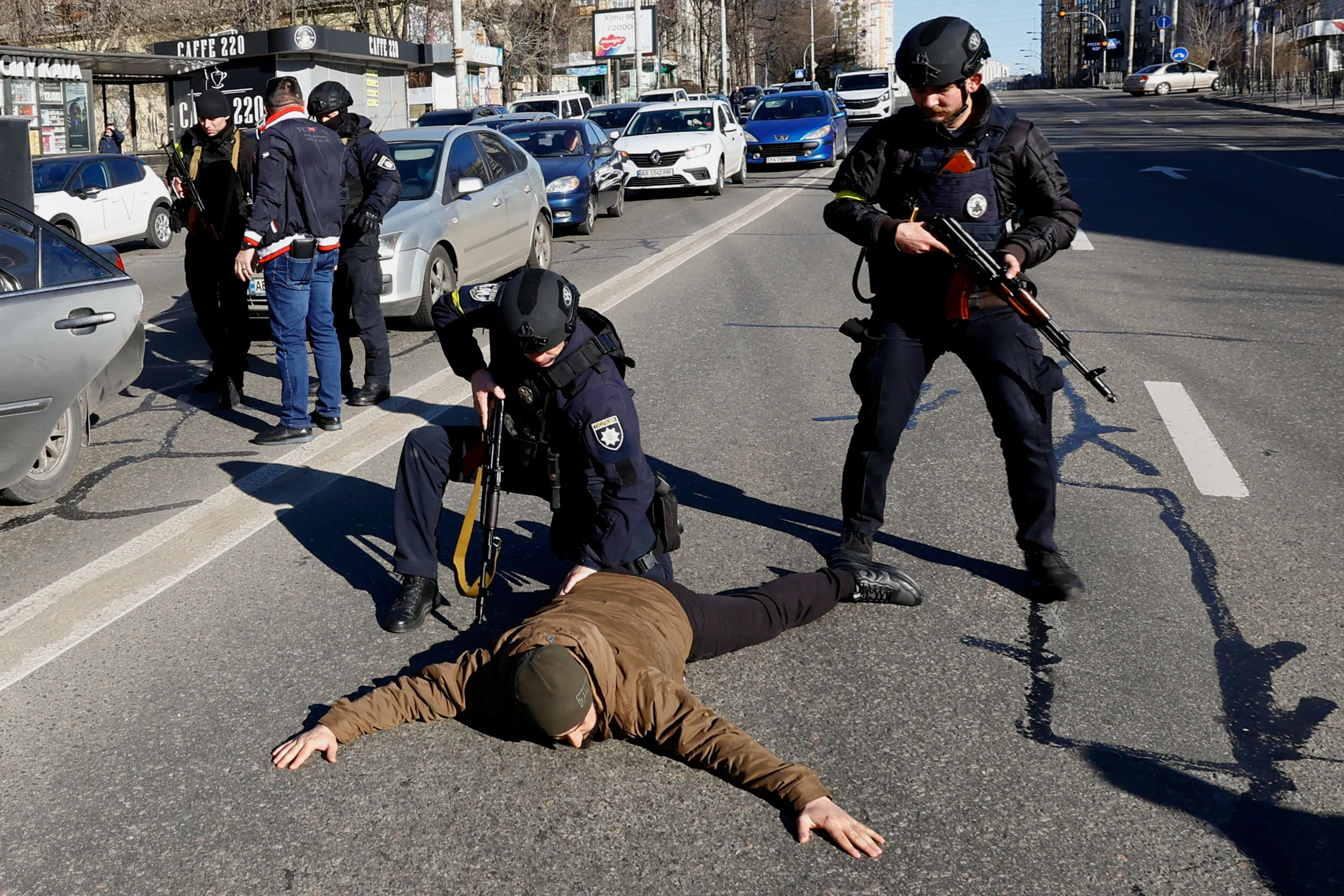 Police officers check people from a suspicious car they stopped, as Russia's invasion of Ukraine continues, in Kyiv, Ukraine on February 28, 2022. (Photo by Umit Bektas/Reuters)