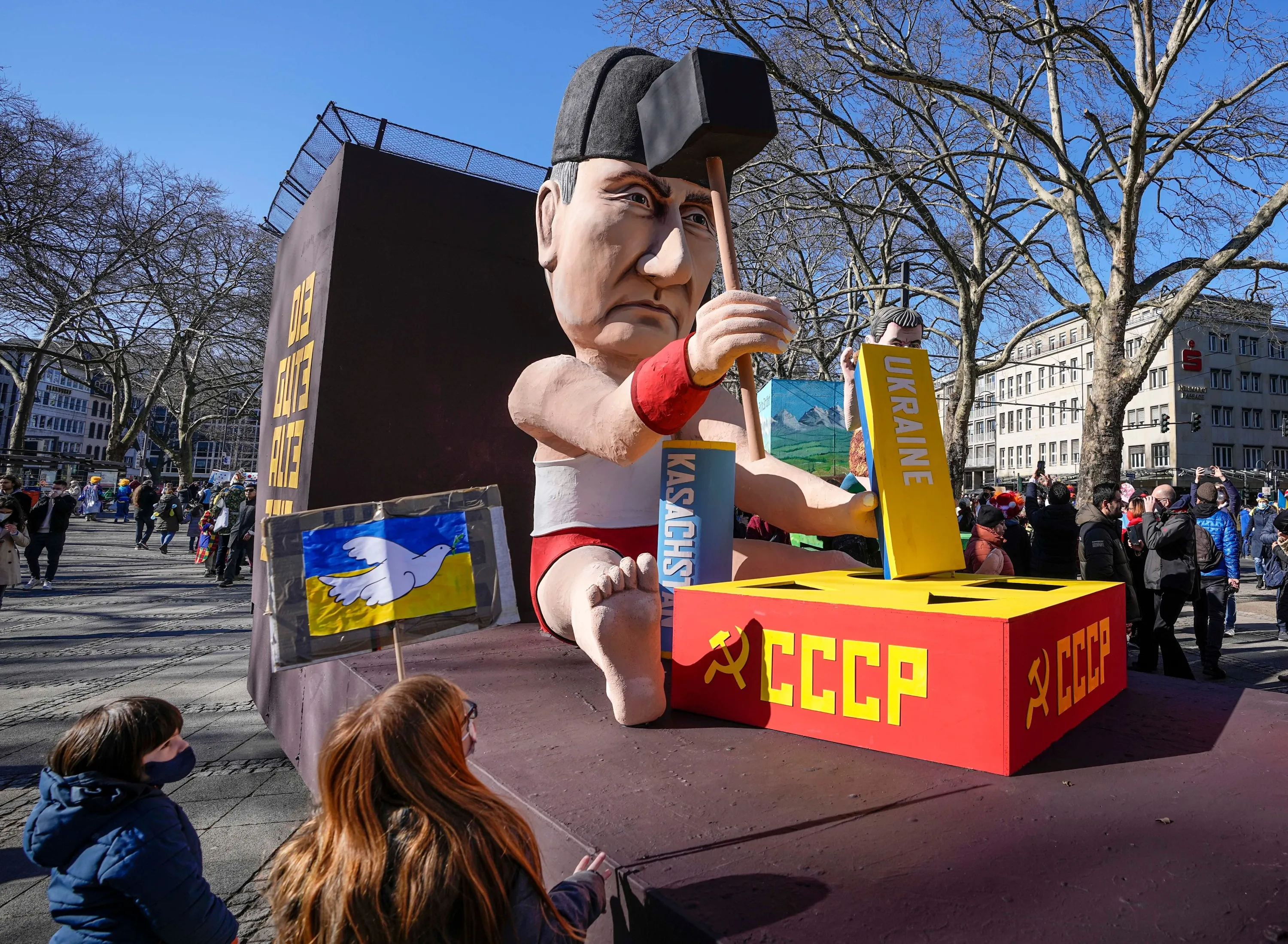 A satirical carnival float depicts Russia's President Vladimir Putin playing with the Ukraine to restore the Soviet Union on a square in Cologne, Germany, during a peace march against the war in Ukraine on Shrove Monday, February 28, 2022. The traditional carnival Rose Monday Parade in Cologne was cancelled due to Russia's war in Ukraine. Instead of the parade, the political carnival floats were placed in the city followed by a peace protest of revelers. (Photo by Martin Meissner/AP Photo)