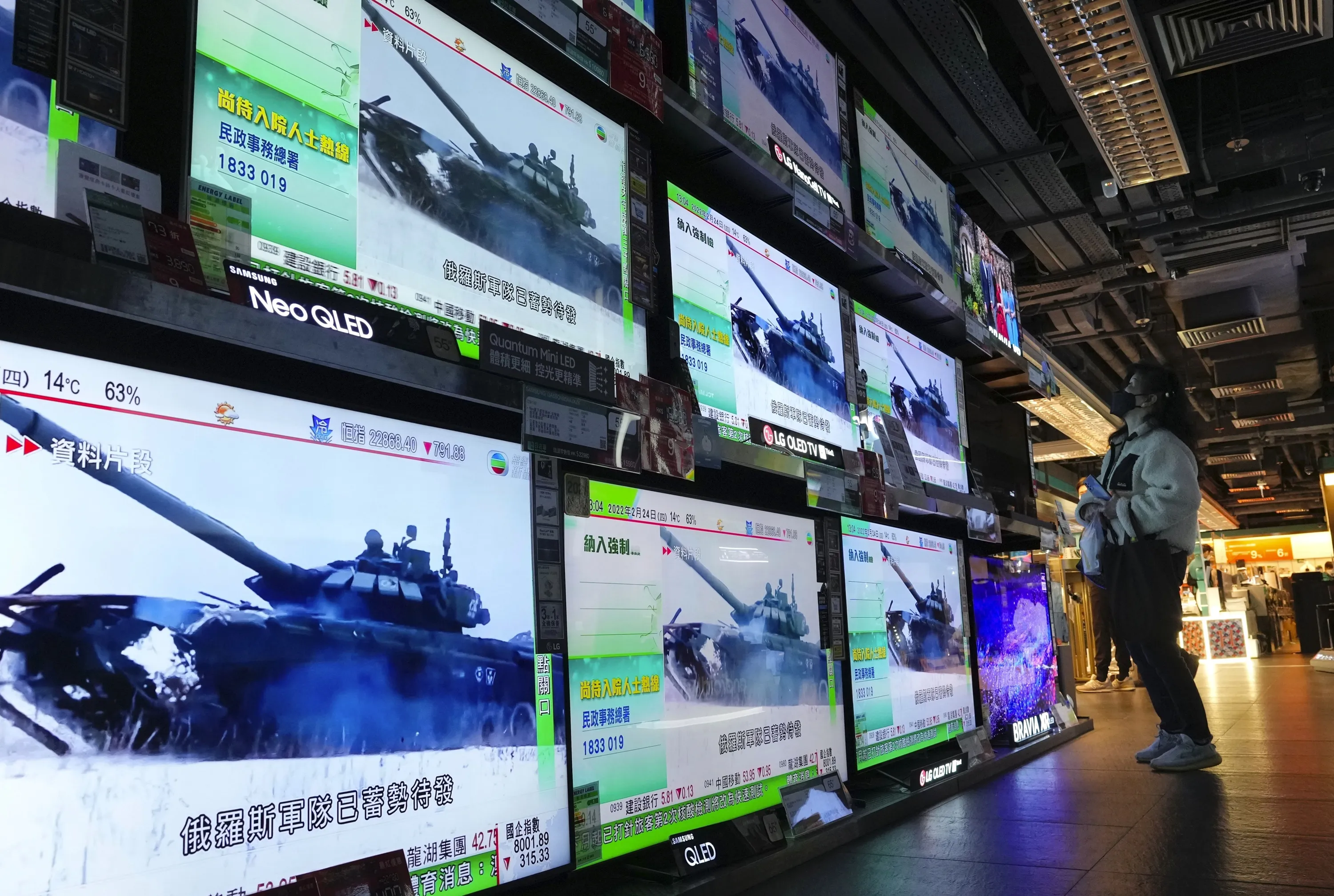 A woman stands in front of TV screens broadcasting the news of Russian troops that launched their attack on Ukraine, in Hong Kong Thursday, February 24, 2022. Russian troops launched their anticipated attack on Ukraine on Thursday, as President Vladimir Putin cast aside international condemnation and sanctions, warning other countries that any attempt to interfere would lead to “consequences you have never seen”. (Photo by Vincent Yu/AP Photo)
