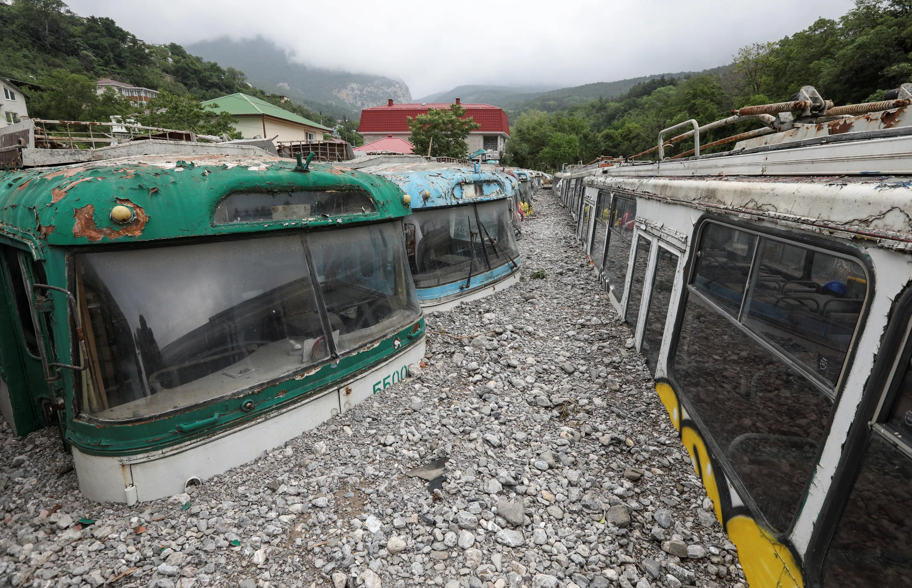 General view of a trolleybus parking after heavy rainfall and floods in Yalta, Crimea on June 22, 2021. (Photo by Alexey Pavlishak/Reuters)