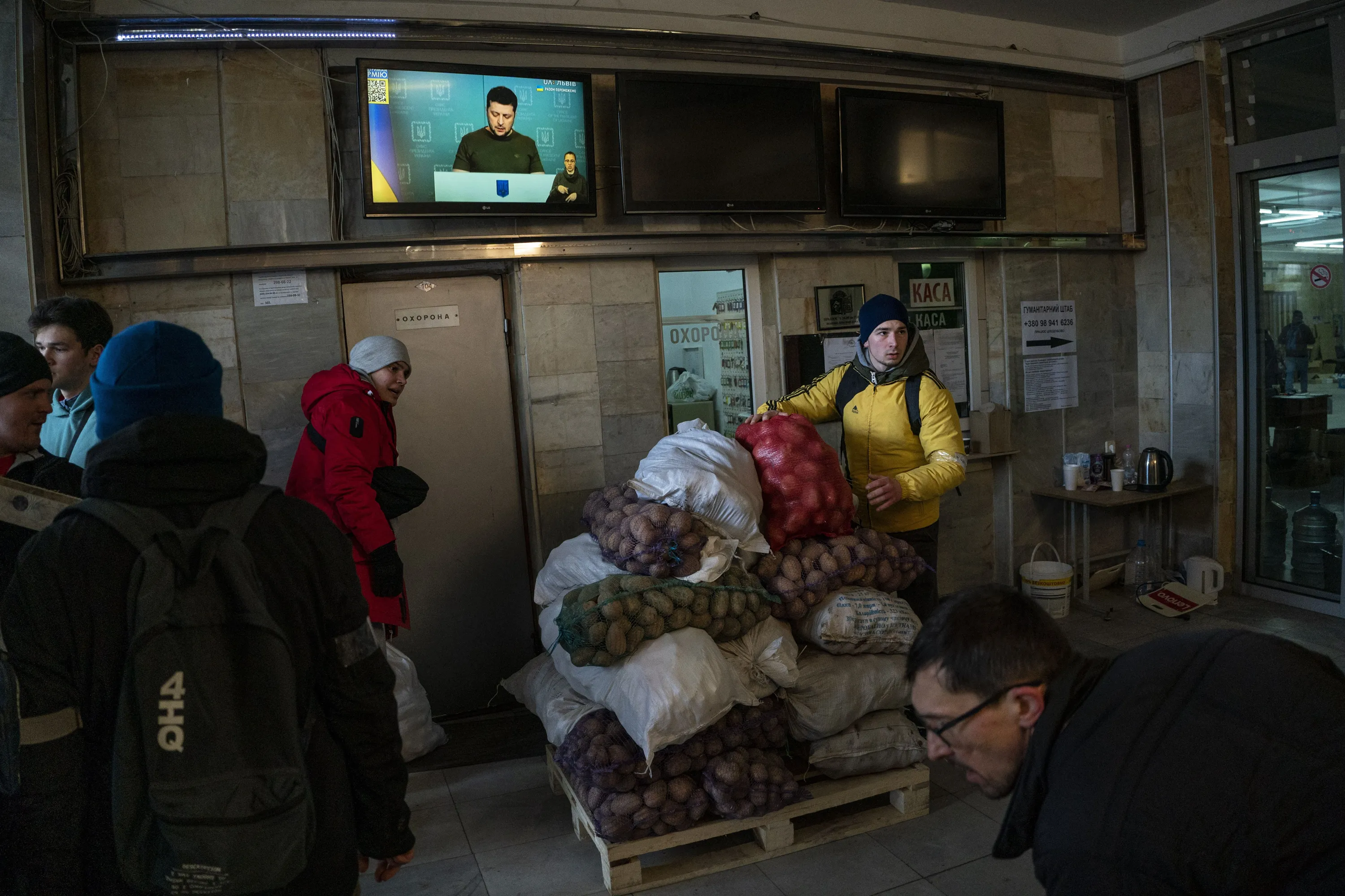 Ukrainian volunteers sort donated foods for later distribution to the local population while Ukrainian President Volodymyr Zelenskiy appears on television in Lviv, western Ukraine, Wednesday, March 2, 2022. (Photo by Bernat Armangue/AP Photo)