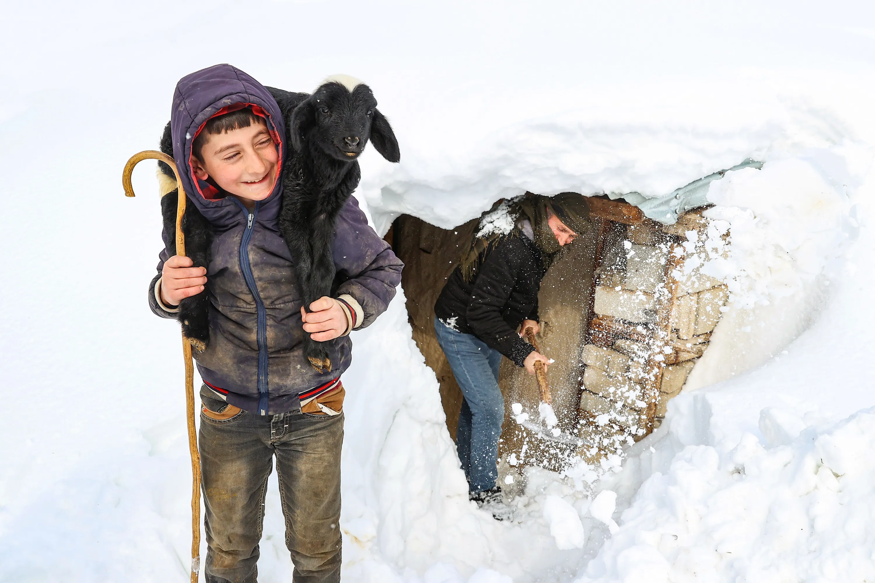 A kid carrying a goat is seen in a snow-covered field in front of his house, in Van, Turkiye on January 29, 2022. The harsh winter conditions in the villages of Van make it difficult for the villagers who make a living from breeding. In some villages, where the snow thickness exceeds 2 meters in places, while trying to clear the snow that rises up to the roofs of the houses, they do not neglect the care of animals, which are their biggest source of income. (Photo by Ozkan Bilgin/Anadolu Agency via Getty Images)