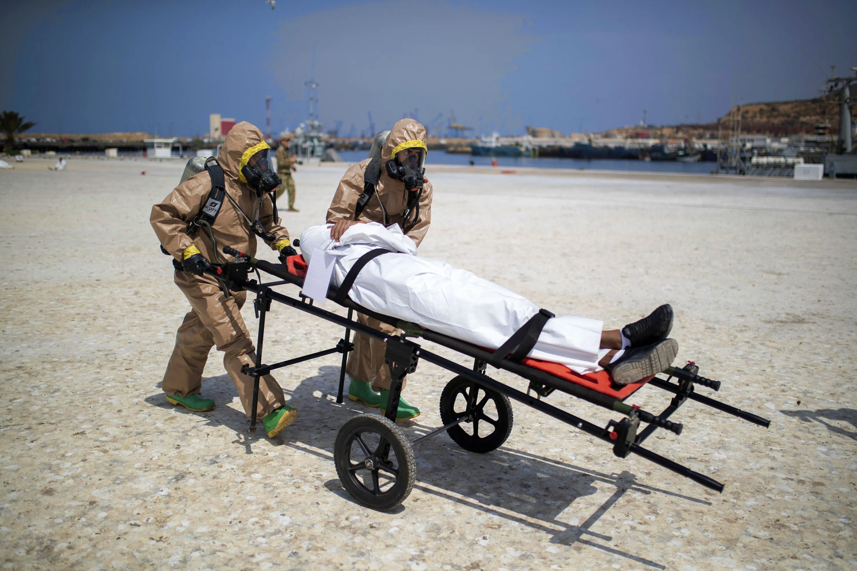 Members of the Moroccan Royal Armed Forces Rescue & Relief Unit take part in a biochemical simulation organized by the U.S Defense Threat Reduction Agency (DTRA) as part of African Lion military exercise, in the port of Agadir, southern Morocco, Tuesday, June 15, 2021. With more than 7,000 participants from nine nations and NATO, African Lion is U.S. Africa Command's largest exercise. (Photo by Mosa'ab Elshamy/AP Photo)