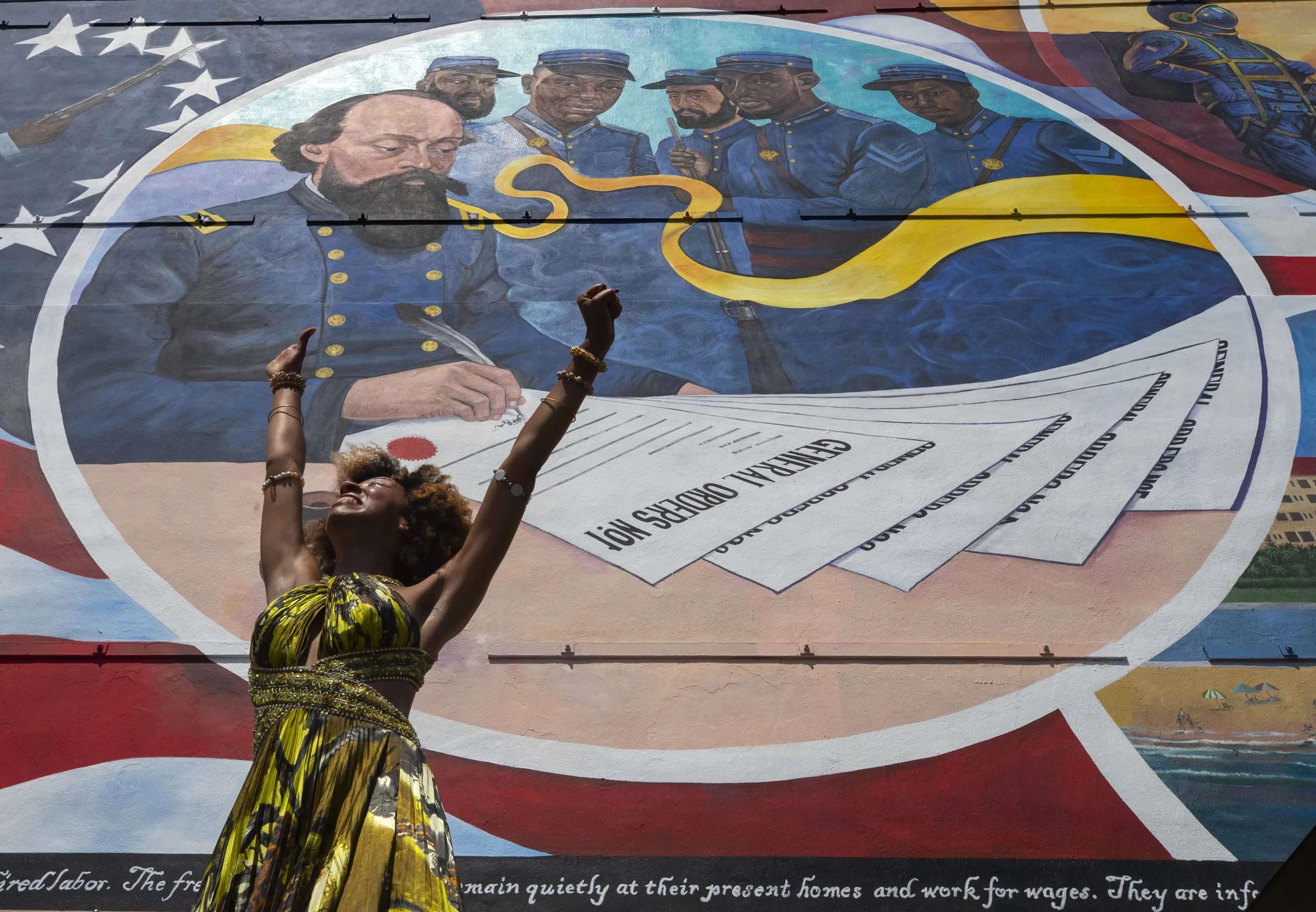 Dancer Prescylia Mae, of Houston, performs during a dedication ceremony for the massive mural “Absolute Equality” in downtown Galveston, Texas, Saturday, June 19, 2021. The dedication of the mural, which chronicles the history and legacy of Black people in the United States, was one of several Juneteenth celebrations across the city. (Photo by Stuart Villanueva/The Galveston County Daily News via AP Photo)