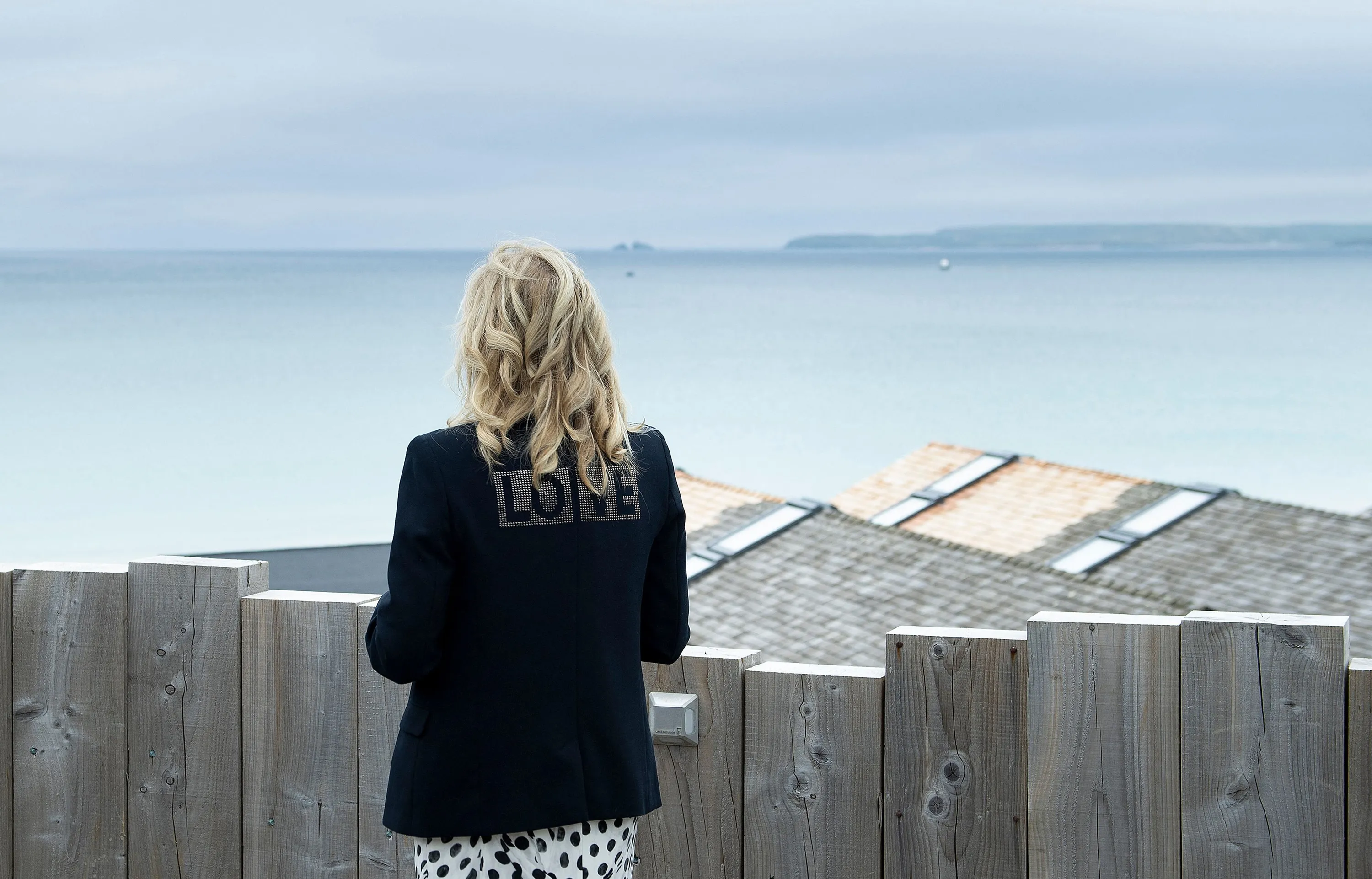 US first lady Jill Biden turns around to show the word "love" on the back of her jacket as she speaks with reporters after visiting with Carrie Johnson, wife of British Prime Minister Boris Johnson, ahead of the G-7 summit, Thursday, June 10, 2021, in Carbis Bay, England. (Photo by Brendan Smialowski/AFP Photo)