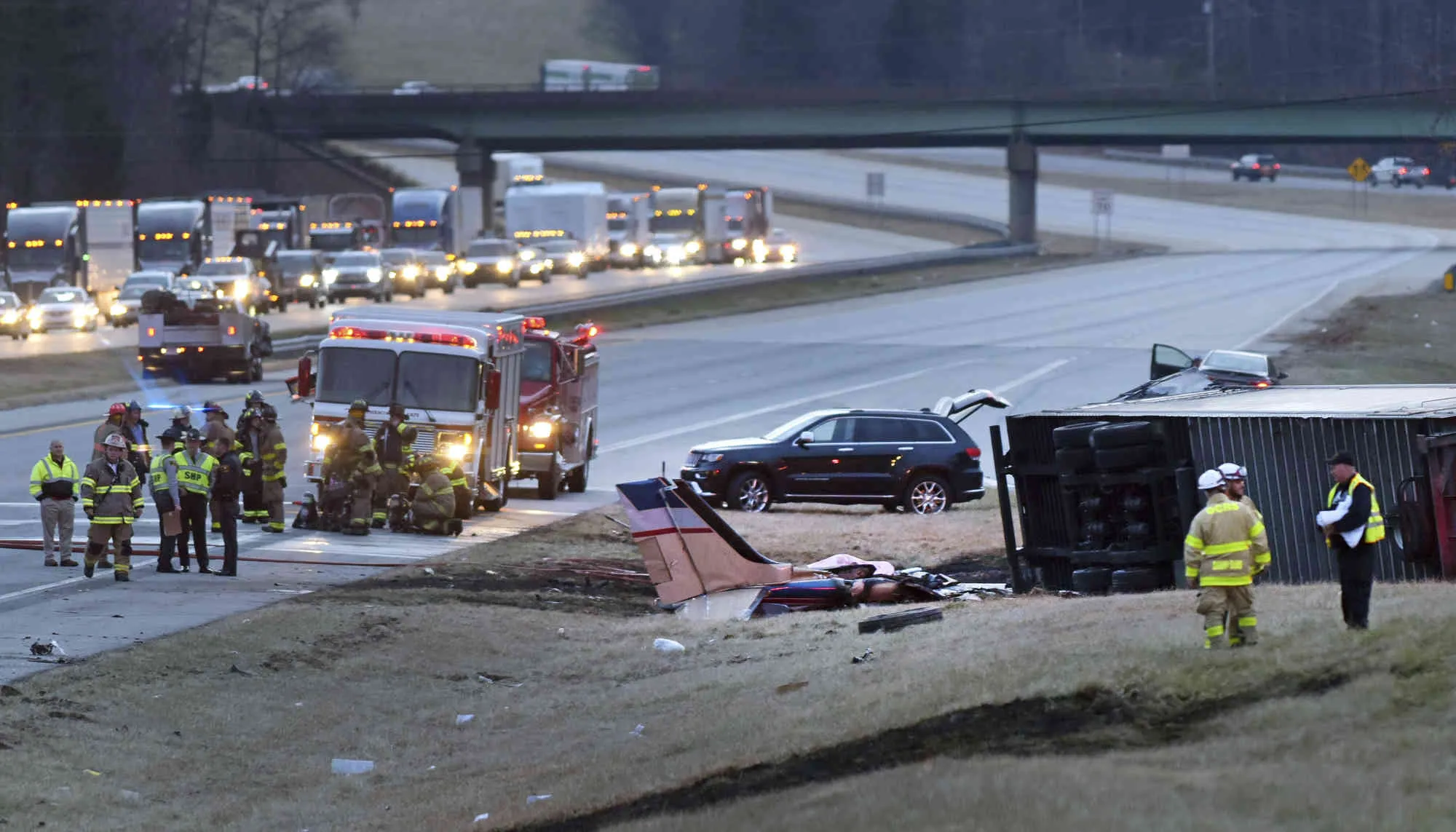 Emergency personnel work at the scene where a twin-engine Beechcraft Barron plane crashed into the tractor-trailer on Interstate 85 South, near the Davidson County Airport in Lexington, N.C., Wednesday, Feb. 16, 2022. (Photo by Walt Unks/The Winston-Salem Journal via AP Photo)