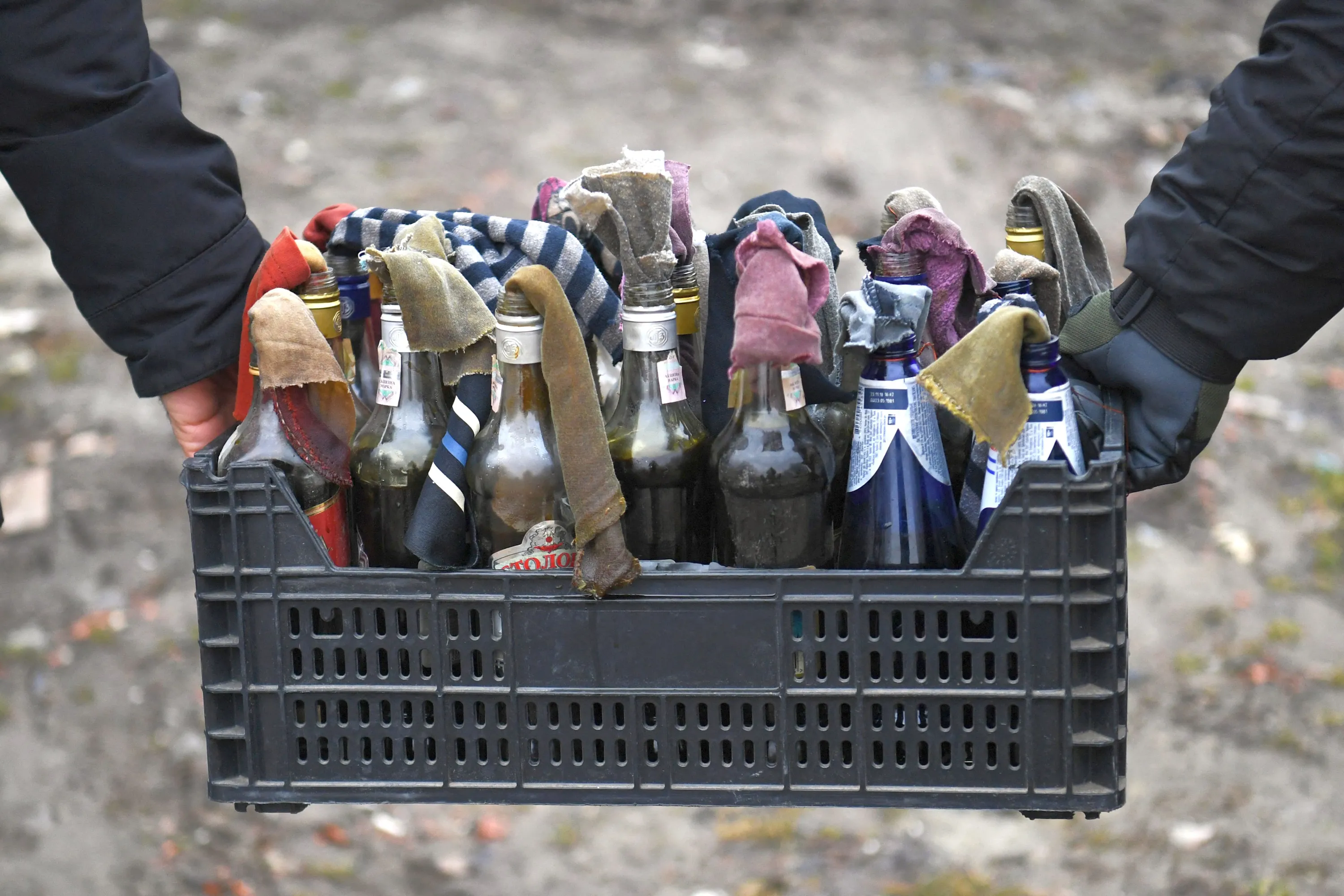 Volunteers hold a basket with hand-made cocktail Molotov's during a self-defence civilian course on the outskirts of Lviv, western Ukraine, on March 4, 2022. (Photo by Daniel Leal/AFP Photo)