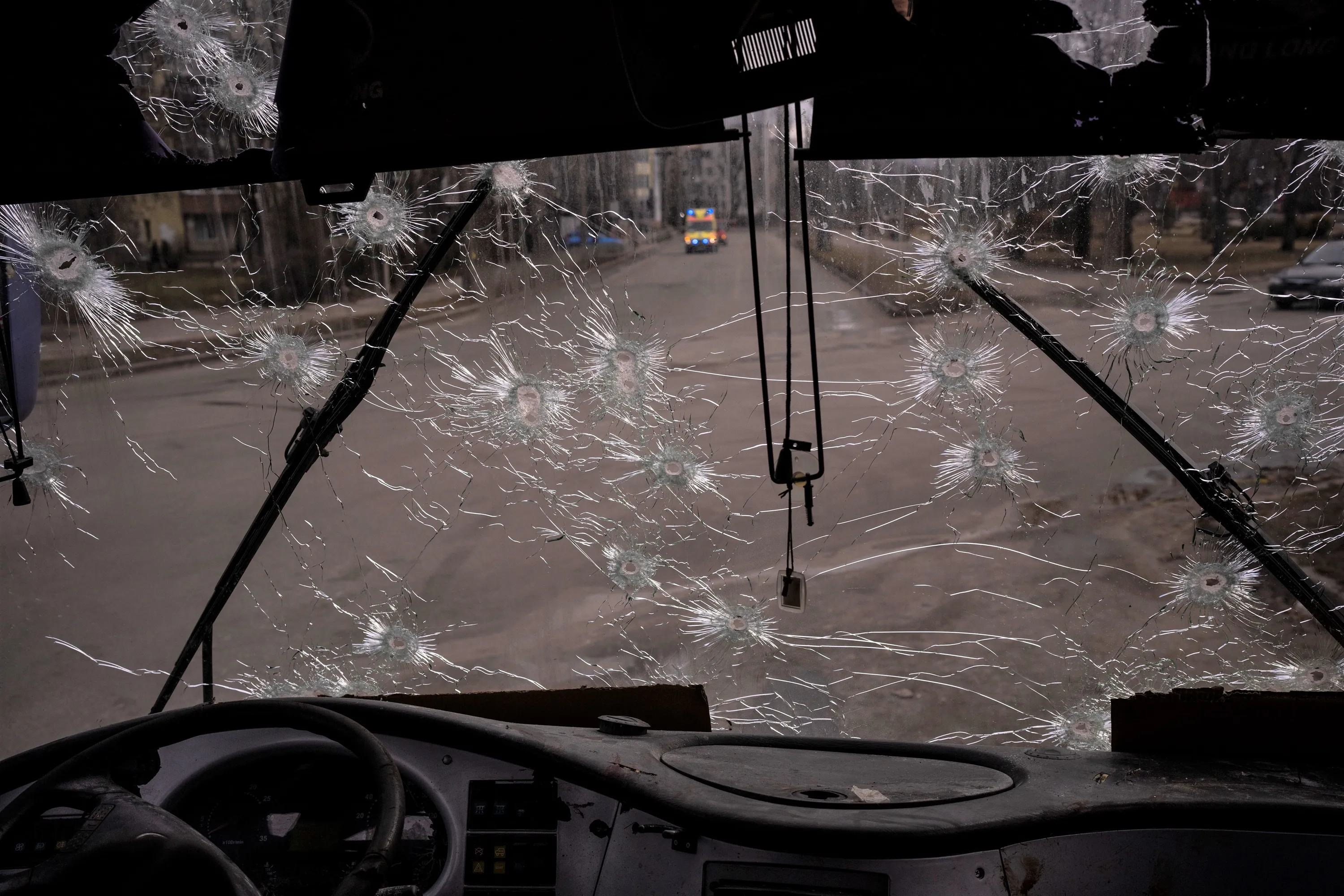 A machine-gunned bus where several people died in an ambush is photographed days after in the city of Kyiv, Ukraine, Friday, March 4, 2022. (Photo by Emilio Morenatti/AP Photo)