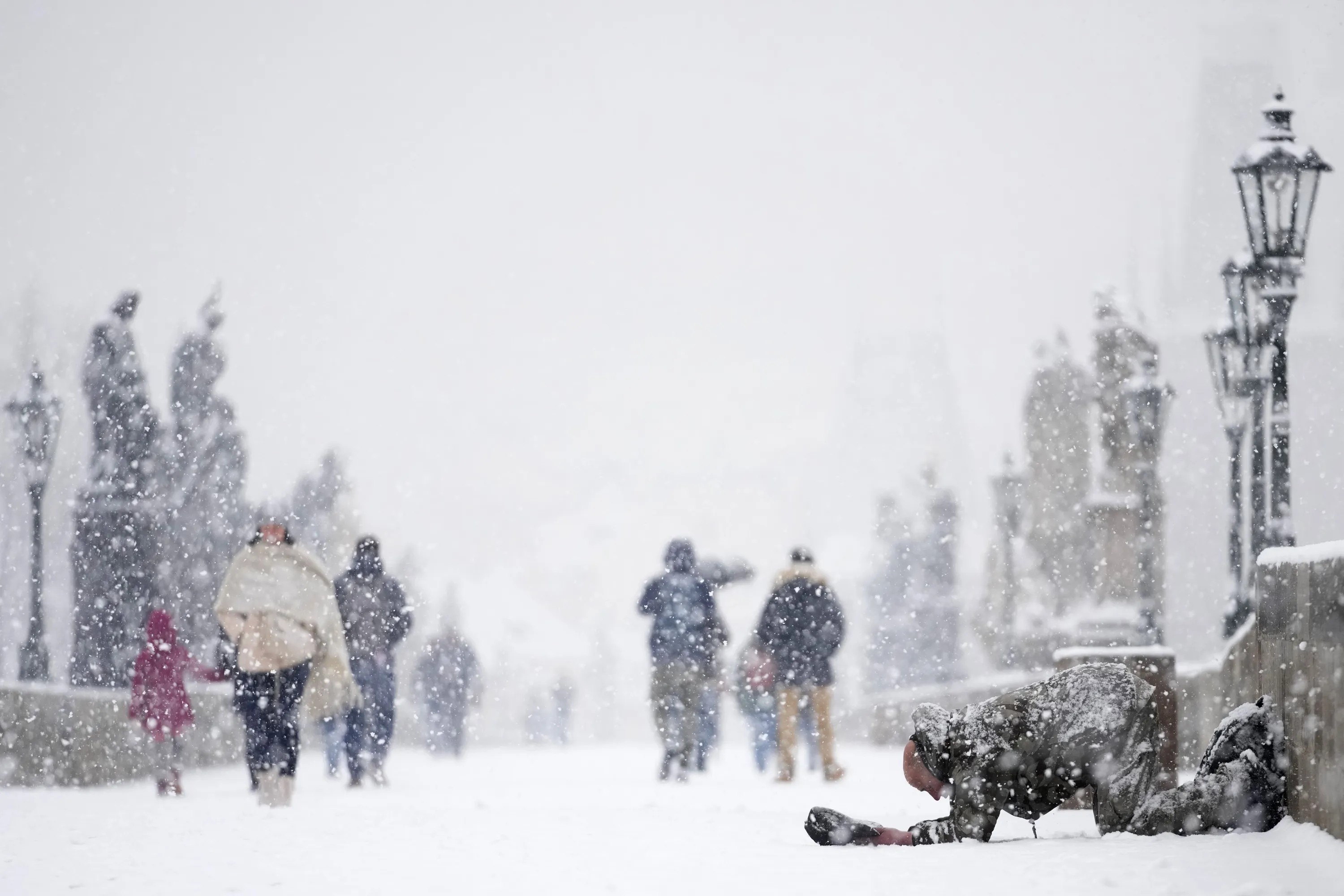 A beggar kneels at the medieval Charles Bridge as snow falls in Prague, Czech Republic, Friday, March 4, 2022. (Photo by Petr David Josek/AP Photo)