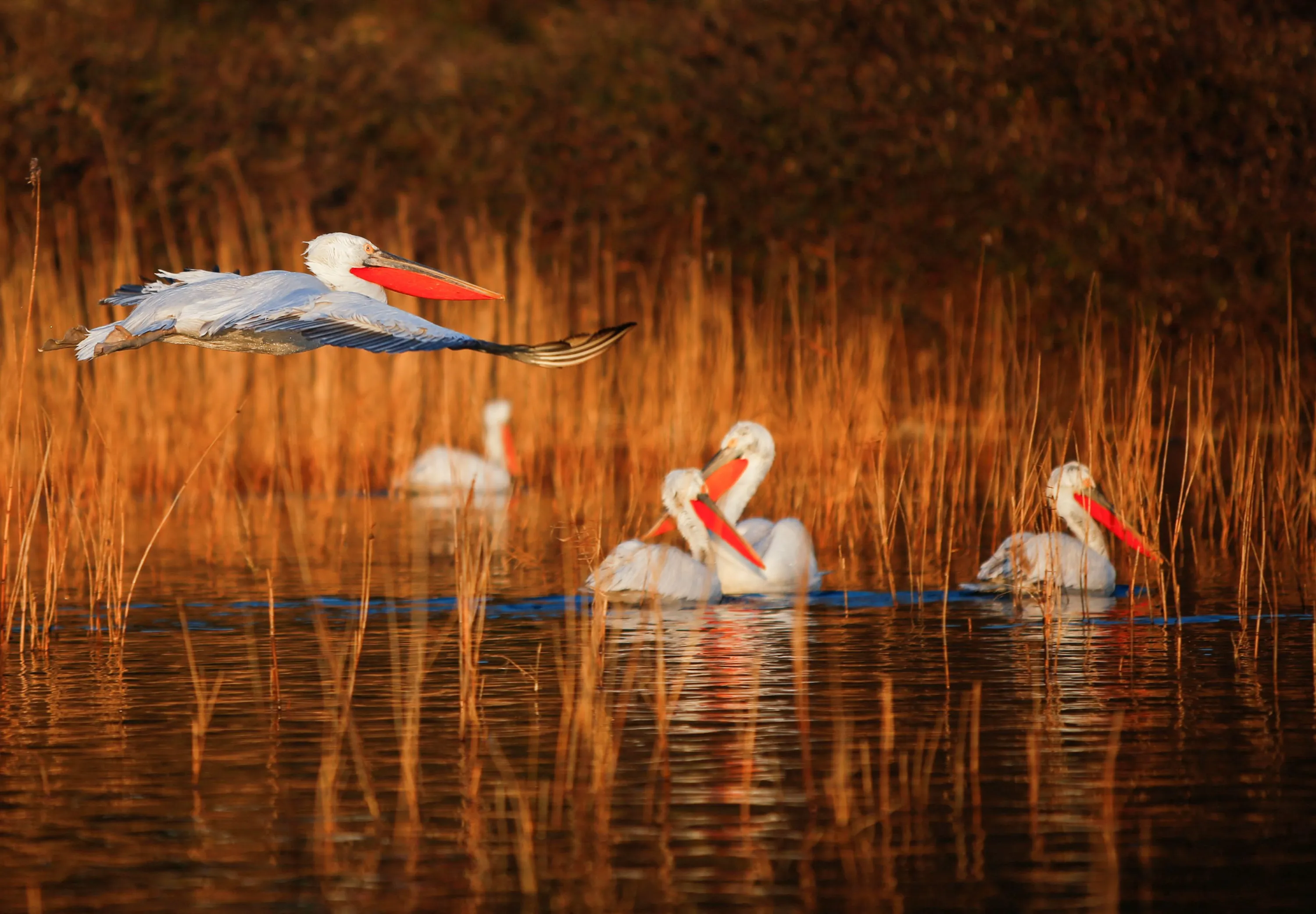 A pelican flies over Dojran lake in the morning sun, in Dojran, North Macedonia on February 11, 2022. Lying on the border of Greece and North Macedonia, the Dojran Lake was once on the verge of totally drying up. Now Dojran Lake is a nature reserve that attracts different species of birds during the winter period due to the relatively warm climate and high quantity of fish. (Photo by Ognen Teofilovski/Reuters)