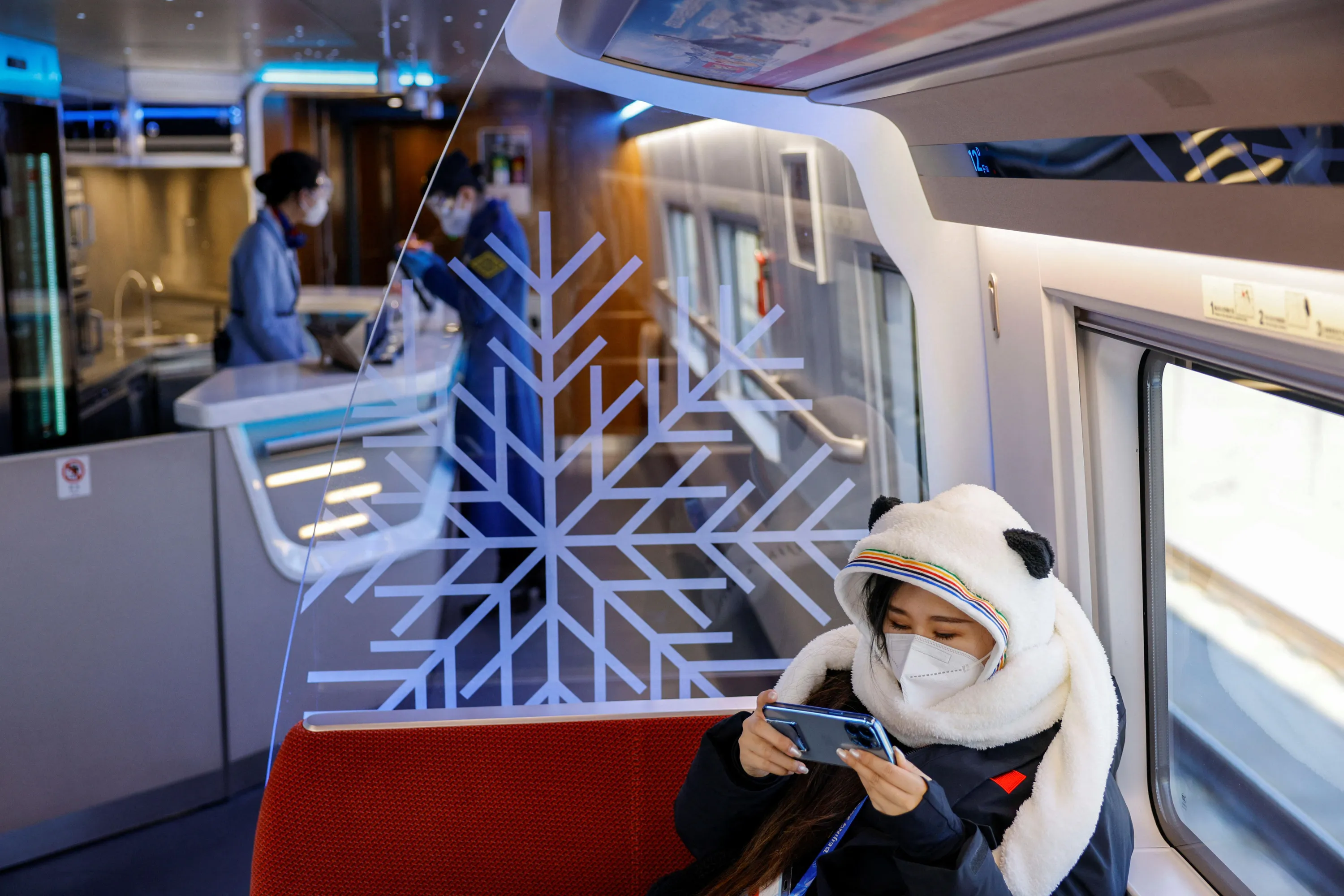 A passenger sits on a high-speed train on the way from Beijing to the Zhangjiakou cluster inside a closed loop area designed to prevent the spread of the coronavirus disease (COVID-19) ahead of the Beijing 2022 Winter Olympics, China January 27, 2022. (Photo by Tyrone Siu/Reuters)