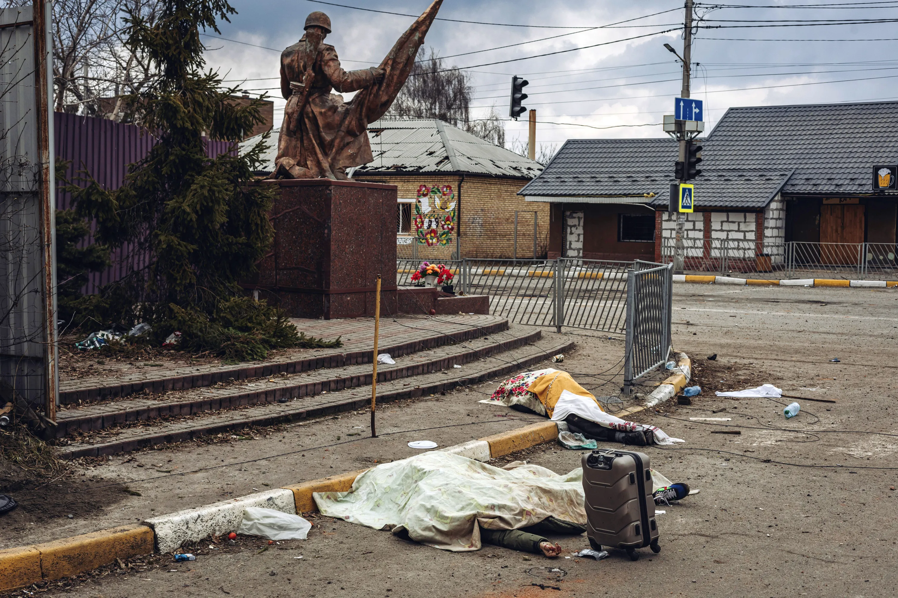 The dead bodies of people killed by Russian shelling lie covered in the street in the town of Irpin, Ukraine, Sunday, March 6, 2022. (Photo by Diego Herrera Carcedo/AP Photo)