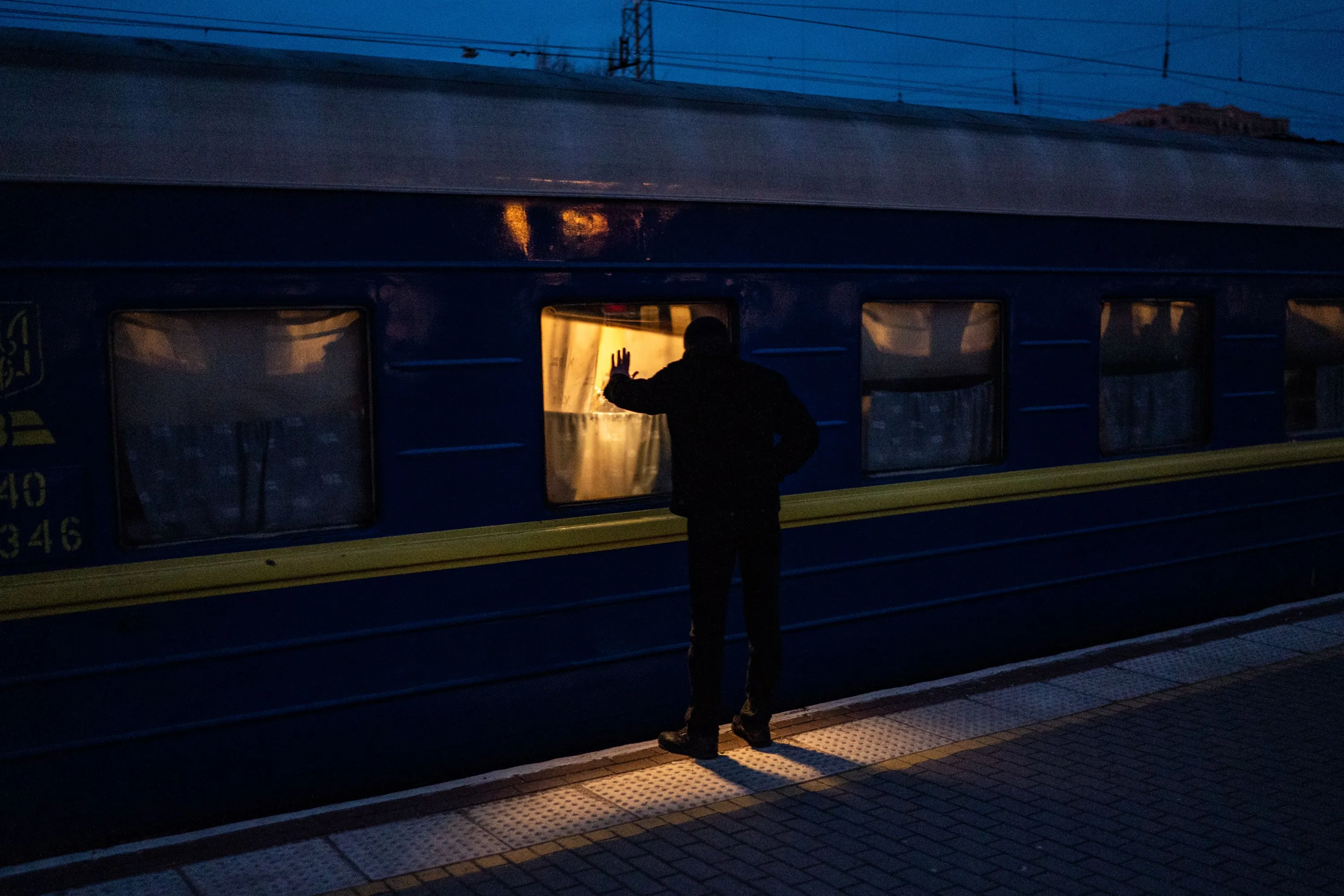 George Keburia says goodbye to his wife Maya and children as they board a train to Lviv at the Odessa train station in Odessa, Ukraine, Saturday, March 5, 2022. Hundreds of Ukrainian women and children along some men who came to say goodbye before going back to fight, were at the train stain trying to leave before the violence of the war reaches the city. (Photo by Salwan Georges/The Washington Post)